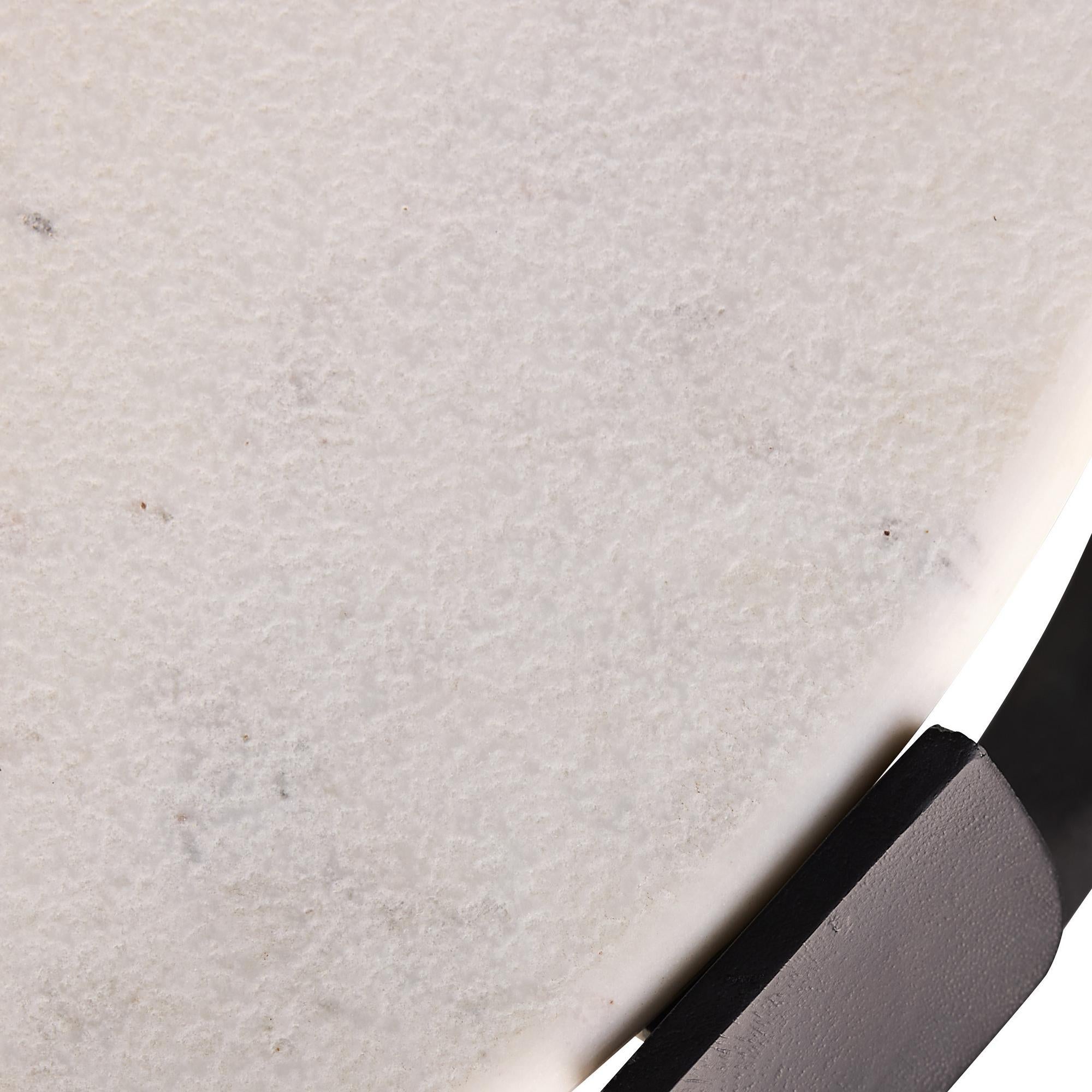 DescriptionThis modern coffee table pairs strength with sculptural grace. An oval top of white leathered marble is suspended by a carved mango wood base in an ebony finish. Finish will vary.