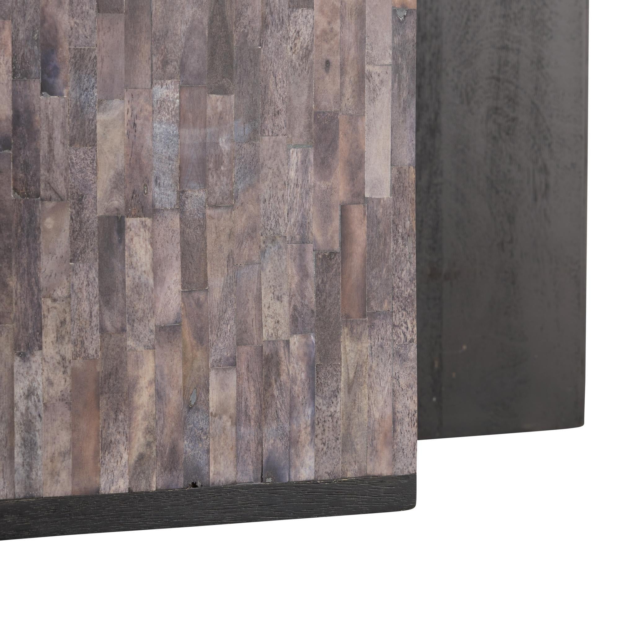 DescriptionCrafted from mango wood in an ebony finish, this 60-inch dining table features a carefully inlaid network of gray bone cascades down the front facing edges of this intersecting base. Comfortably accommodates four to six guests. Finish will vary.