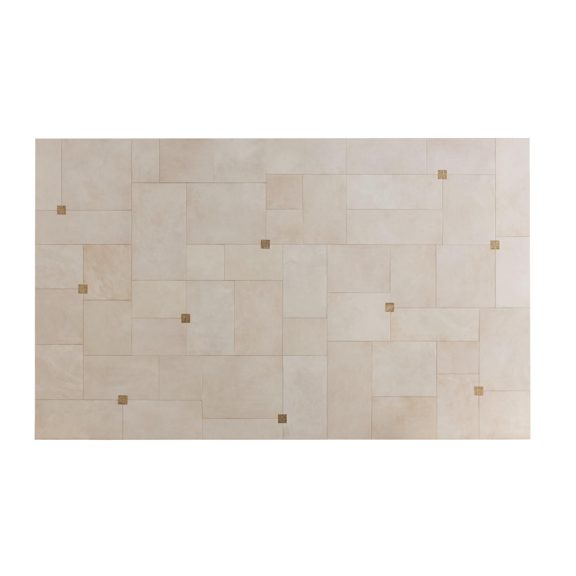 DescriptionThis simple waterfall form features patchworked tiles of ivory vellum and punctuated with antique brass accents, the layered finish delivers a pixilated effect that draws the eye. Vellum will vary.