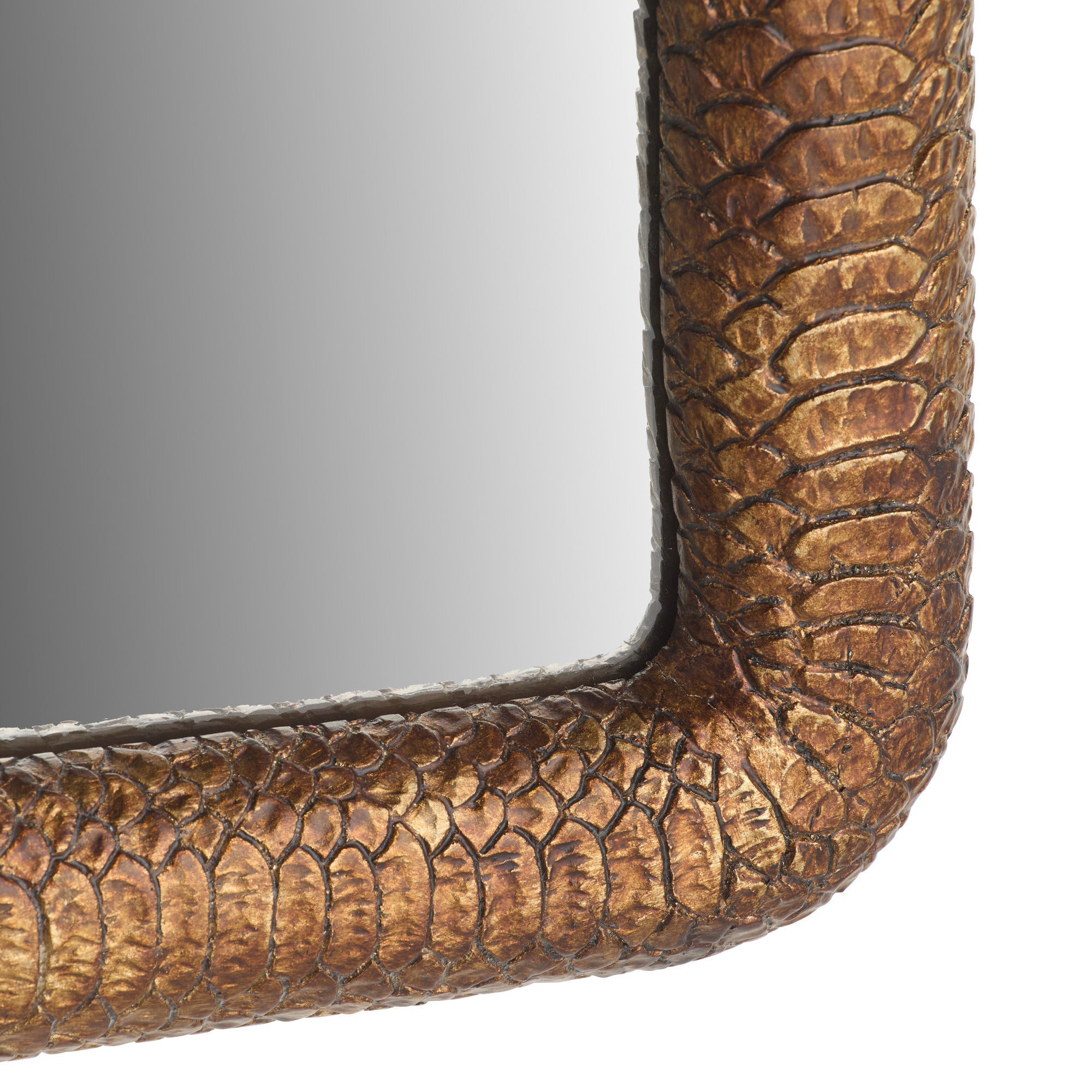 DescriptionThe textural scales of a snake inform our rectangular mirror's frame. Cast resin and lacquered in antiqued gold, its subtly curved silhouette can be a singular accent in a powder room or displayed in multiples along a hallway. Designed to be hung vertically or horizontally, it is secured with a back cleat. Hanging hardware included. Finish will vary.
