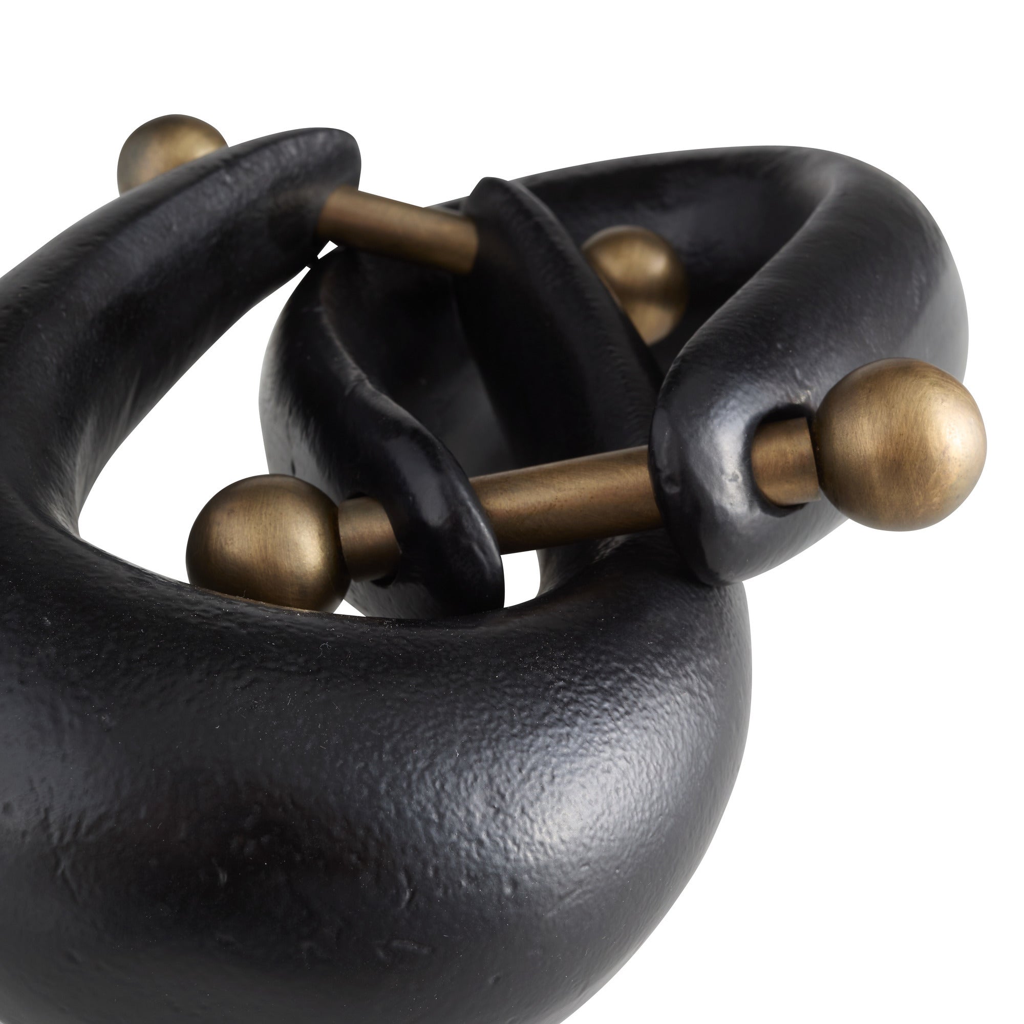 DescriptionThis sculptural form inspired by elongated hoop earrings are artfully formed of blackened cast aluminum and pierced with antique brass iron accents. These intertwined sculptures add a hint of whimsy to any surface. Finish will vary.