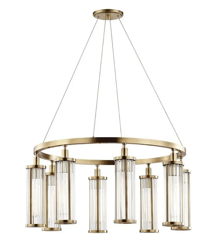 The Marcus 8 Light Pendant in Burnished Brass combines industrial elegance with refined craftsmanship. Its aged brass frame supports eight individual clear glass cylinder shades crafted from thick glass rods, creating a striking visual statement while diffusing light with understated warmth. This contemporary fixture seamlessly blends modern sensibilities with subtle retro character, making it an ideal focal point for sophisticated interiors seeking both style and substance.