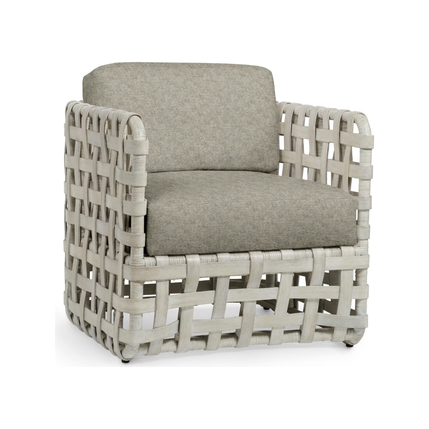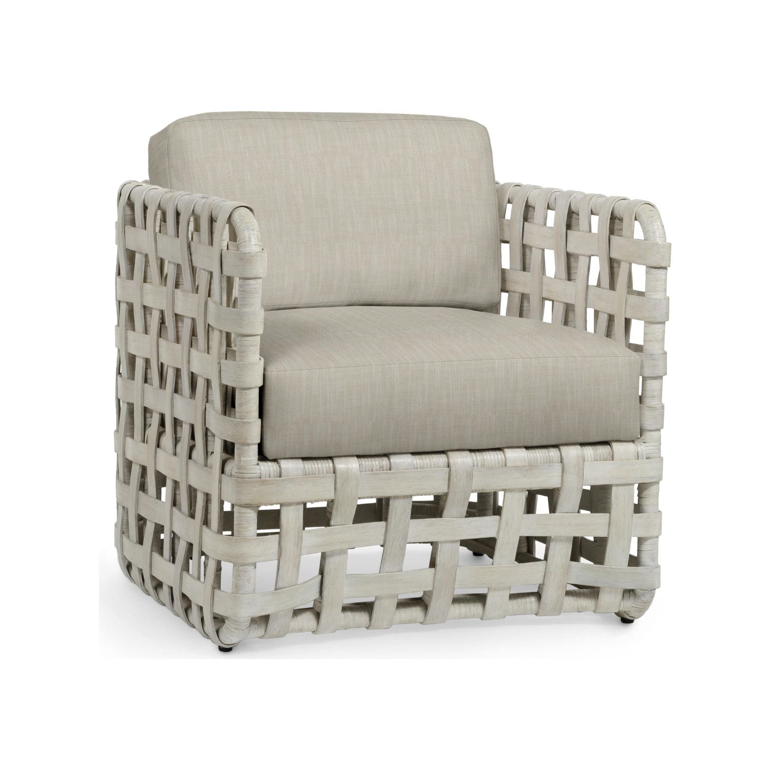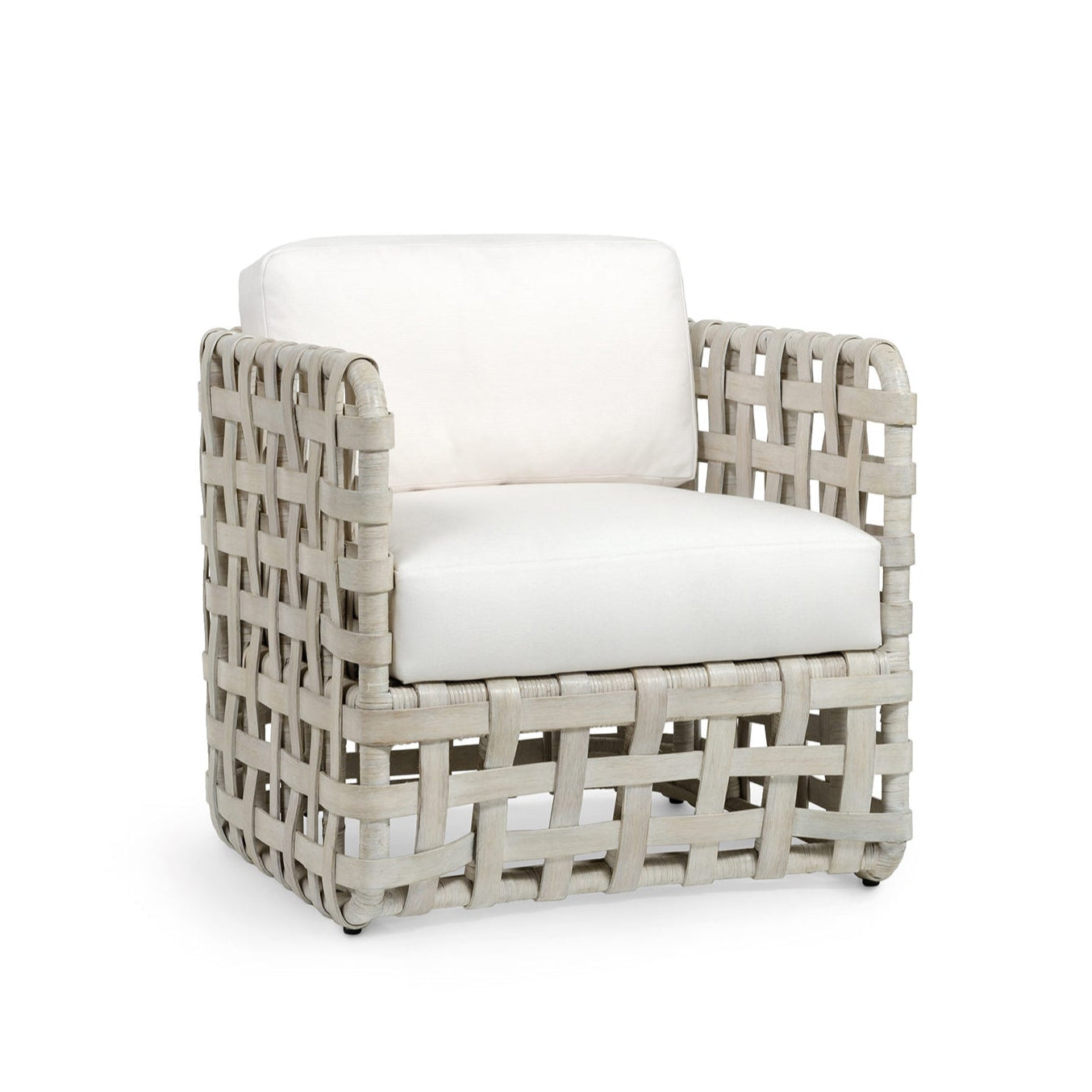 DescriptionLarge pole rattan frame features a hand-woven double wall back and sides of thick rattan slats all in whitewash finish. Chair comes with a fixed upholstered seat and a loose back cushion.