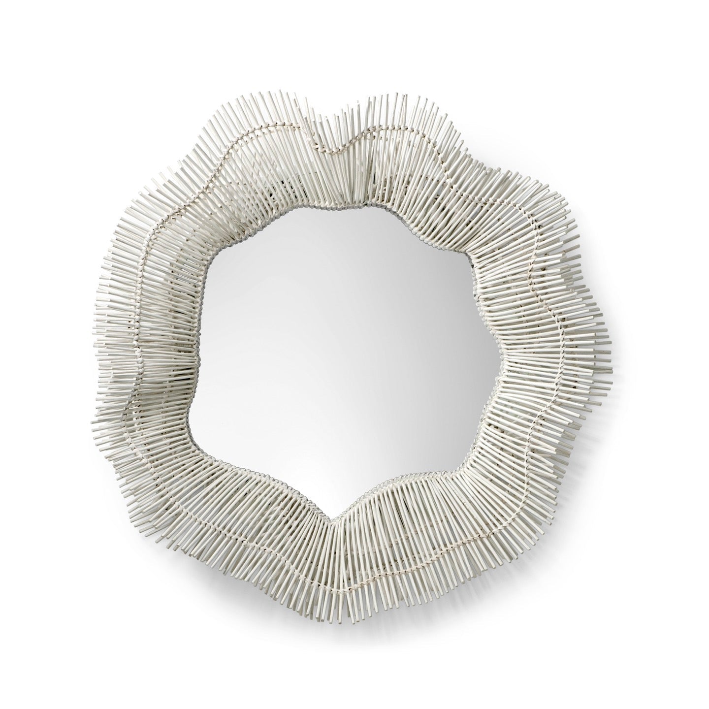 DescriptionMirror features round core rattan sticks accented with rattan peel bindings over a metal frame all in a chalk-white finish. Mirror has a metal cleat for mounting.