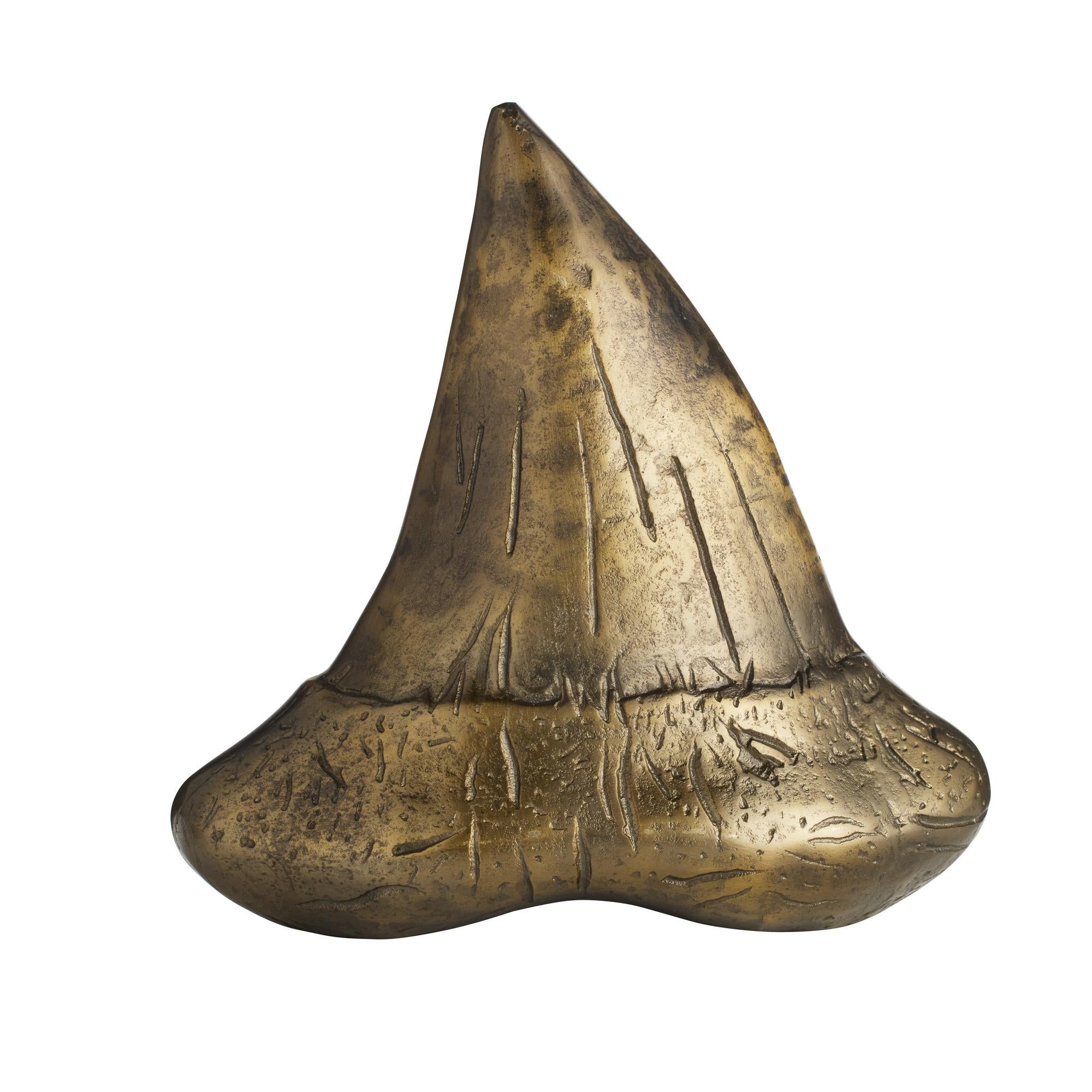 DescriptionThis oversized nod to a shark's tooth adds adventurous intrigue to a shelf, credenza, or cocktail table. Cast of antique brass aluminum with a hollow center, it can be displayed standing up or on its side for different effects. Felt dots cushion the base.