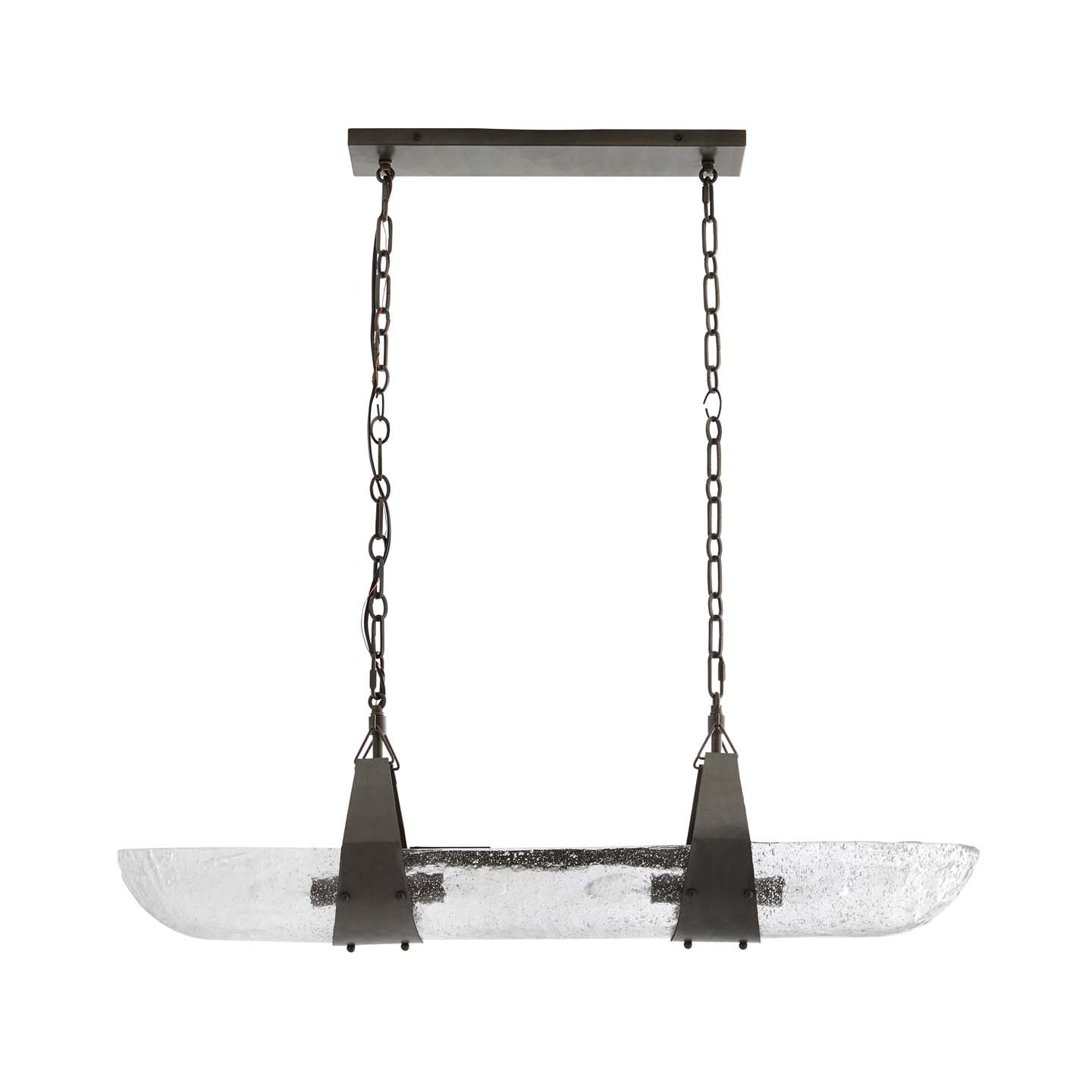 DescriptionThe elongated concave shade is crafted from clear seedy slump glass and is held by graphite leather harnesses that suspend from english bronze iron chains. Four lights are neatly concealed behind the glass and provide ample illumination. Finish will vary. Additional chain available (chn-265). Damp-rated, although limited covered outdoor areas may affect finish