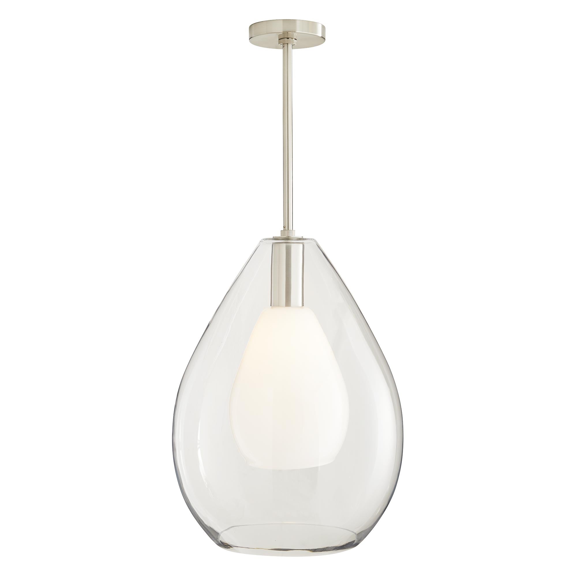 DescriptionSeemingly simple in its design, an inner teardrop-shaped shade conceals a standard bulb in opal glass, then a larger shade rests outside it, exposing the inner piece in clear glass. Both hang from a stainless steel stem and mount, both finished in brushed nickel. Additional pipe available (pipe-181). Also available in antique brass (49098). Damp-rated, although limited covered outdoor conditions may affect finish