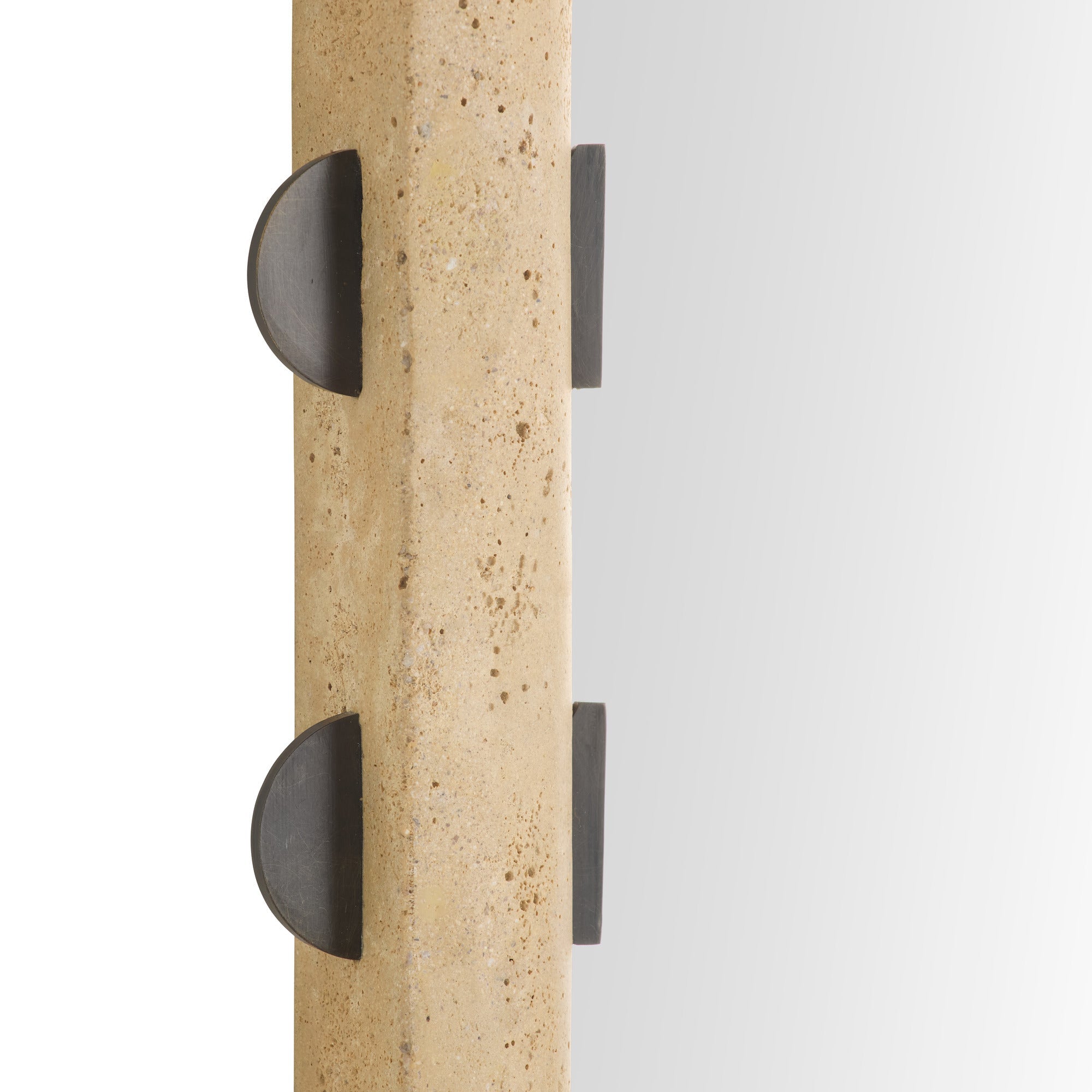 DescriptionA modern mix of materials elevates a simple oval mirror. Framed by cast resin in a travertine finish, the edges are punctuated with bronzed finished iron accents in a pattern mimicking delicate stitches. A bold addition to any powder room, this mirror can be displayed vertically or horizontally with a back cleat for hanging. Hanging hardware included. Finish will vary.