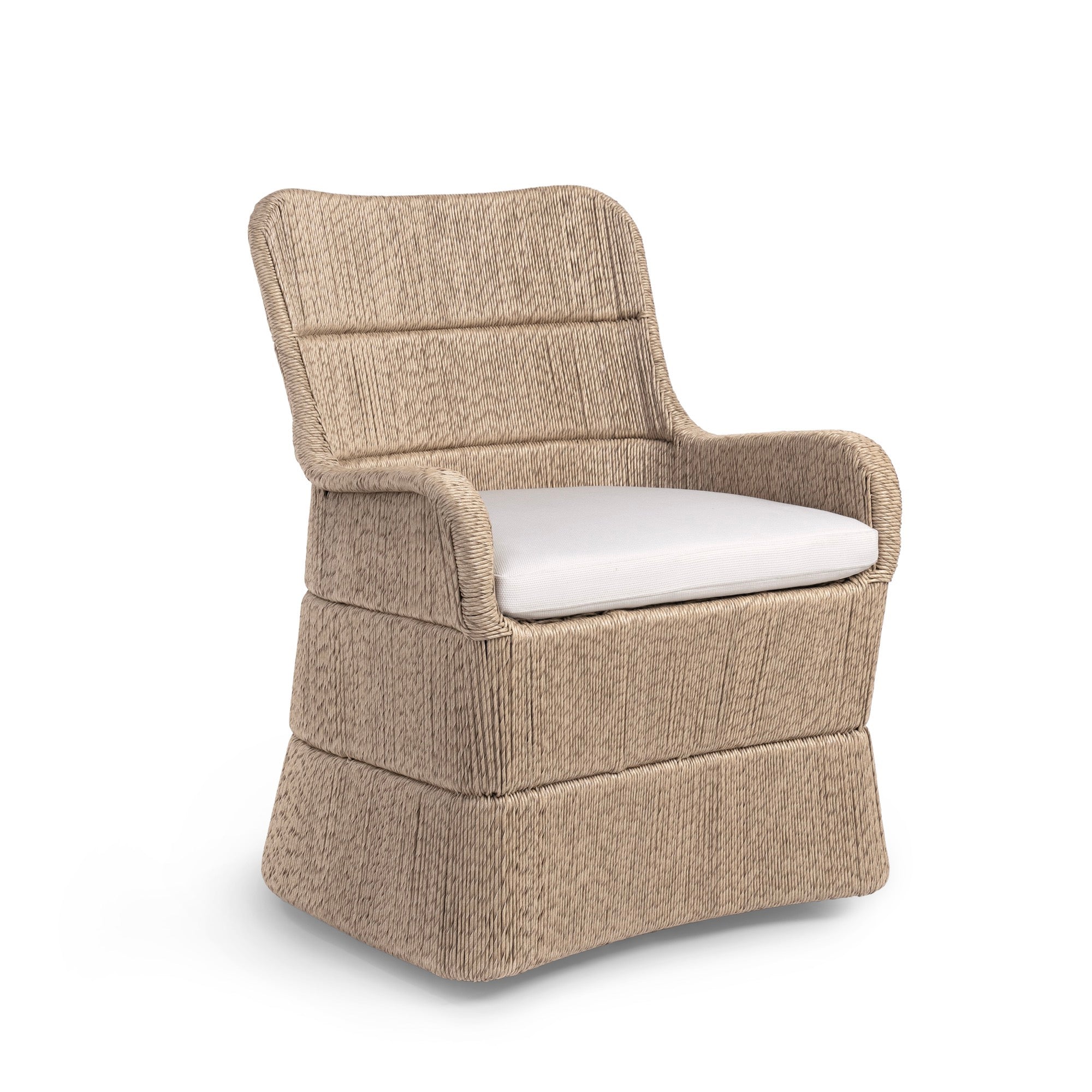 DescriptionHand-twisted synthetic wicker in a natural two-tone brown finish woven horizontally over a powder coated metal frame in a layered design on the inside and outside back, arms and front apron. Weave is resistant to cracking, peeling, fading and breaking. Chair features a 360 degree swivel mechanism with a loose seat and back cushion and is fully outdoor suitable.