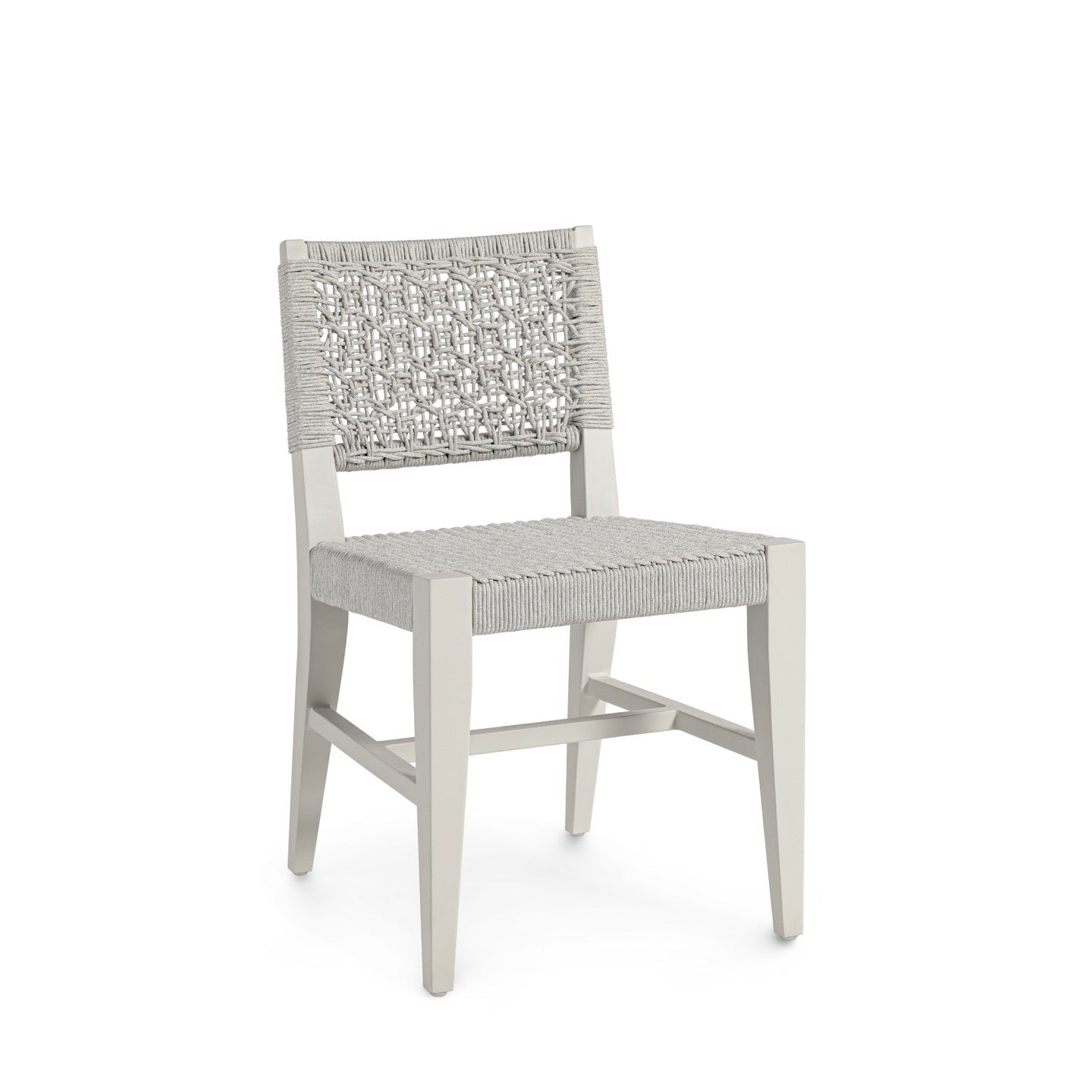 DescriptionHand-woven all weather synthetic rope seat and backrest in a stone grey finish over a powder coated aluminum frame in a white finish. Weave is resistant to cracking, peeling, fading and breaking. Coordinates with the Oliver outdoor stone collection.