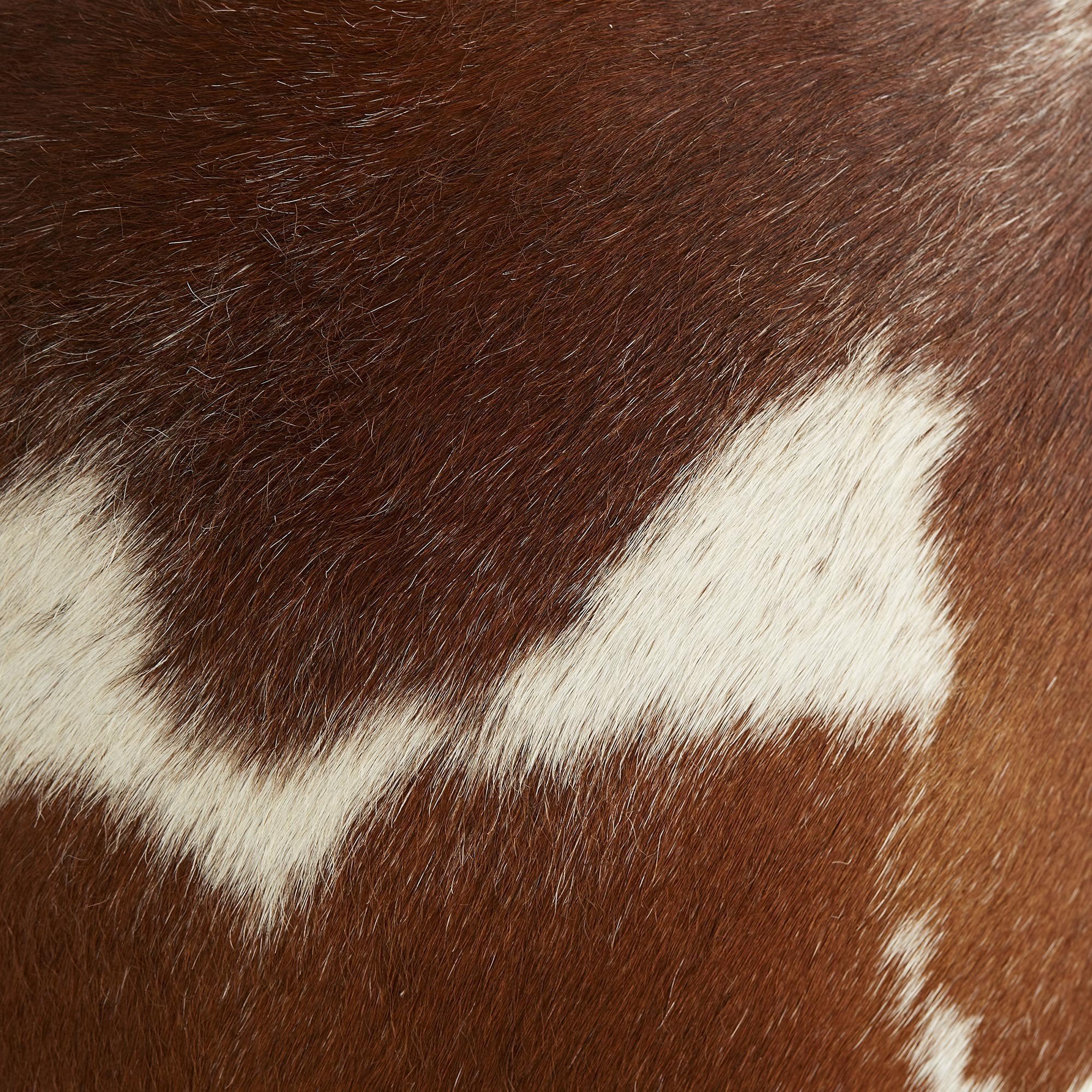 DescriptionThis overstuffed hide stool is soft to the touch and a plush place to rest your feet. Swatches of hide ranging in tones from deep mocha to an auburn caramel dapple the surface in natural grain and texture. Each one no matter the tones has a beautiful finish carefully upholstered with an almost hidden interior stitch. The drum structure rests on disk feet wrapped in top grain leather. Hide tones patterns and textures will vary.