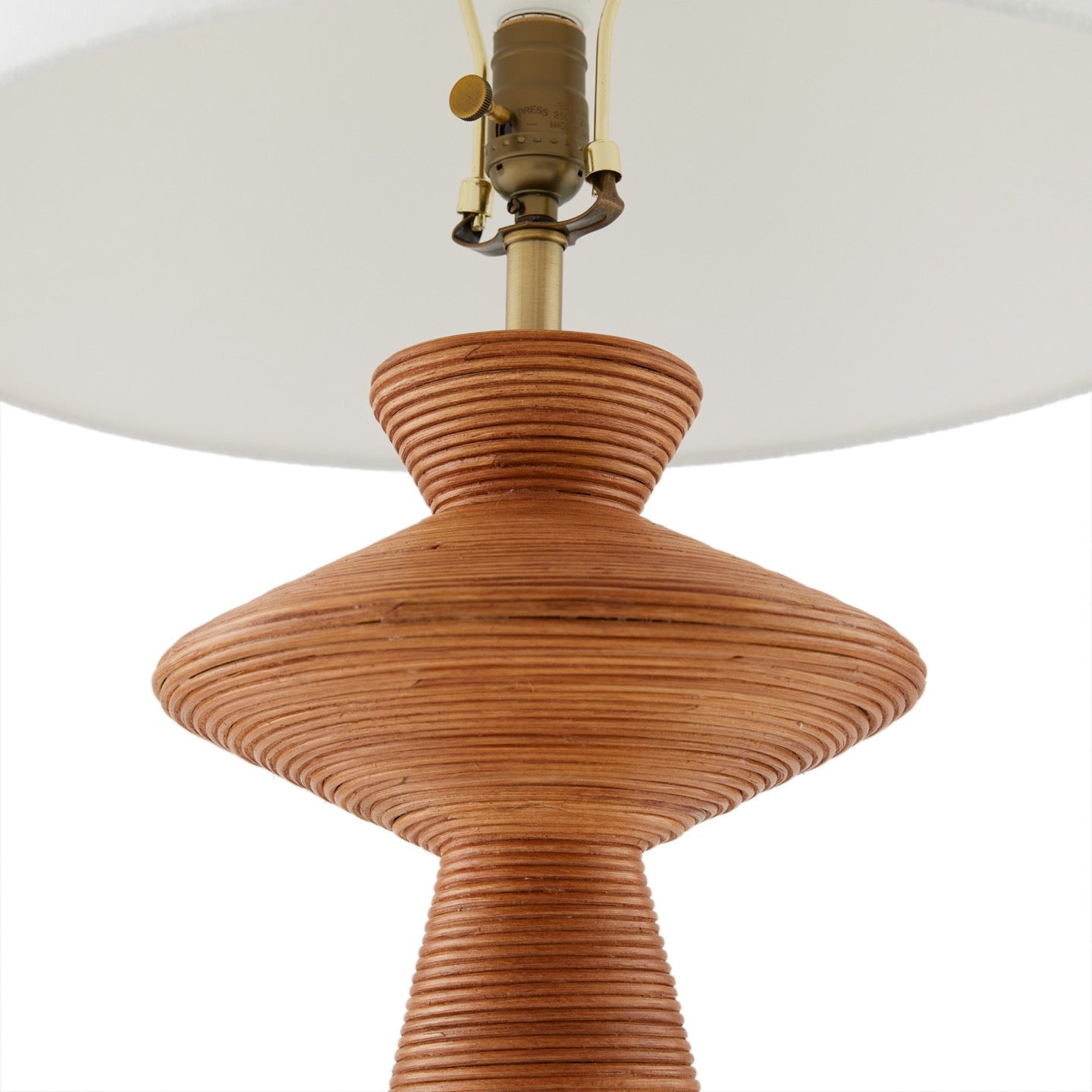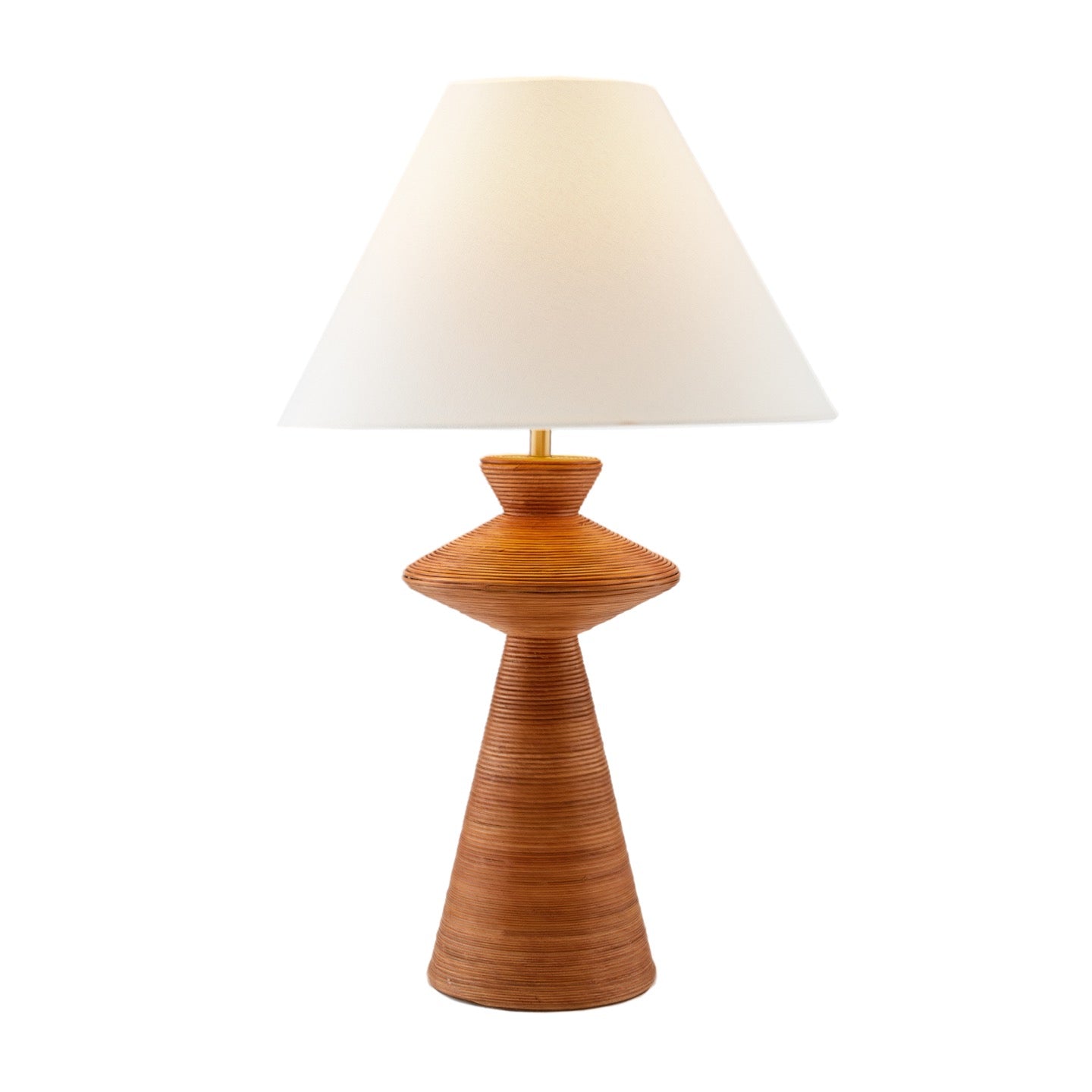 DescriptionWith retro roots, our palista lamp is designed in a classic, mid-century form and recast with a modern sensibility. The angular table lamp, in honey rattan, features a cinched waist and a matching spherical finial. The lamp is topped with a tapered, off-white linen shade lined in white cotton. Finish will vary. All Arteriors lighting pieces are re - wired with black wiring. During the re-wiring process for AU/NZ certification this items ceramic sockets have been replaced with black plastic sockets.
