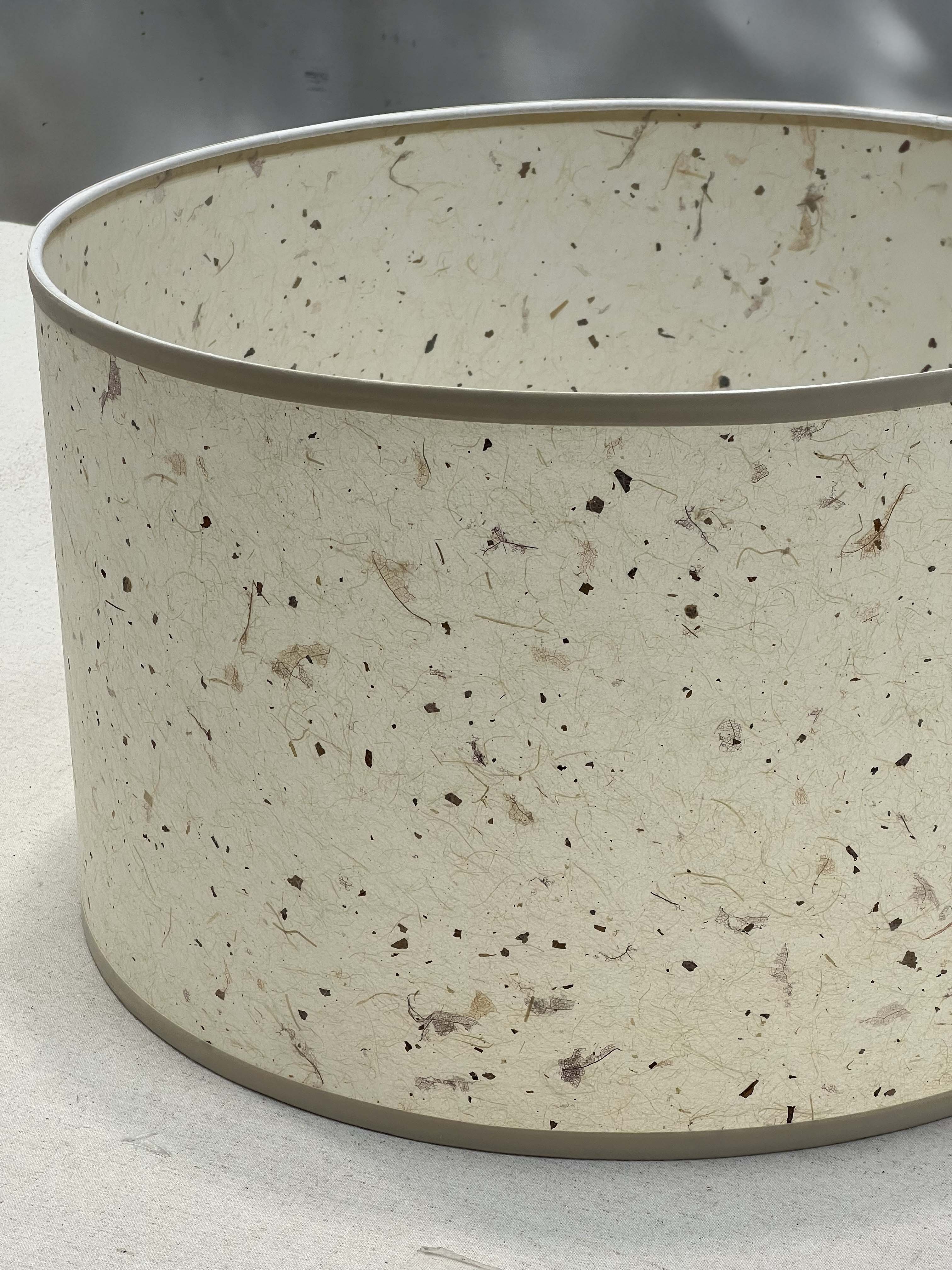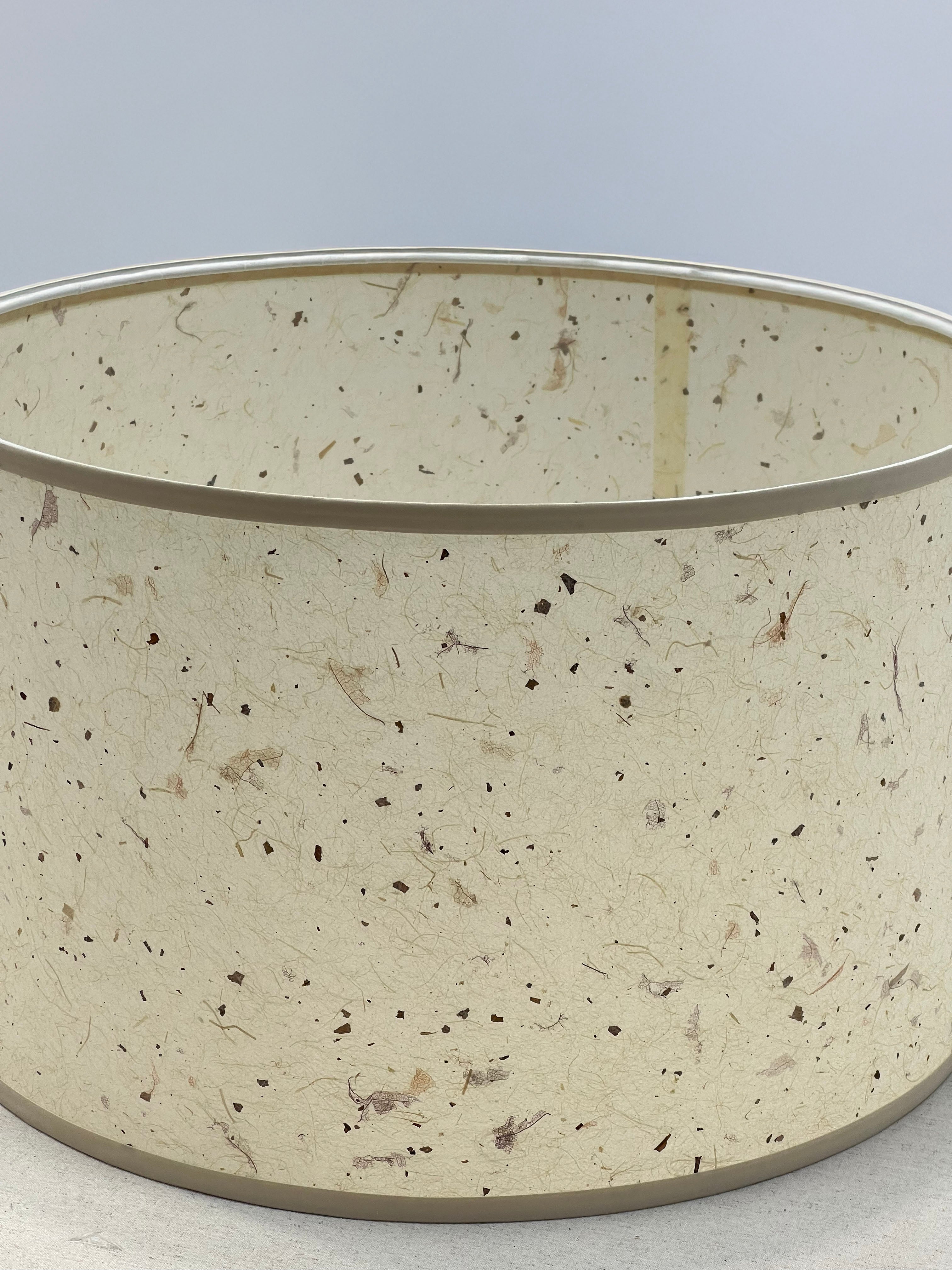 Discover understated elegance with this drum shade, featuring a naturally textured parchment surface in warm, earthy tones that evoke organic sophistication. The tactile finish creates visual depth while the cream chintz trim provides a refined border detail. This shade diffuses light beautifully, casting a gentle glow that brings warmth and character to any interior setting.