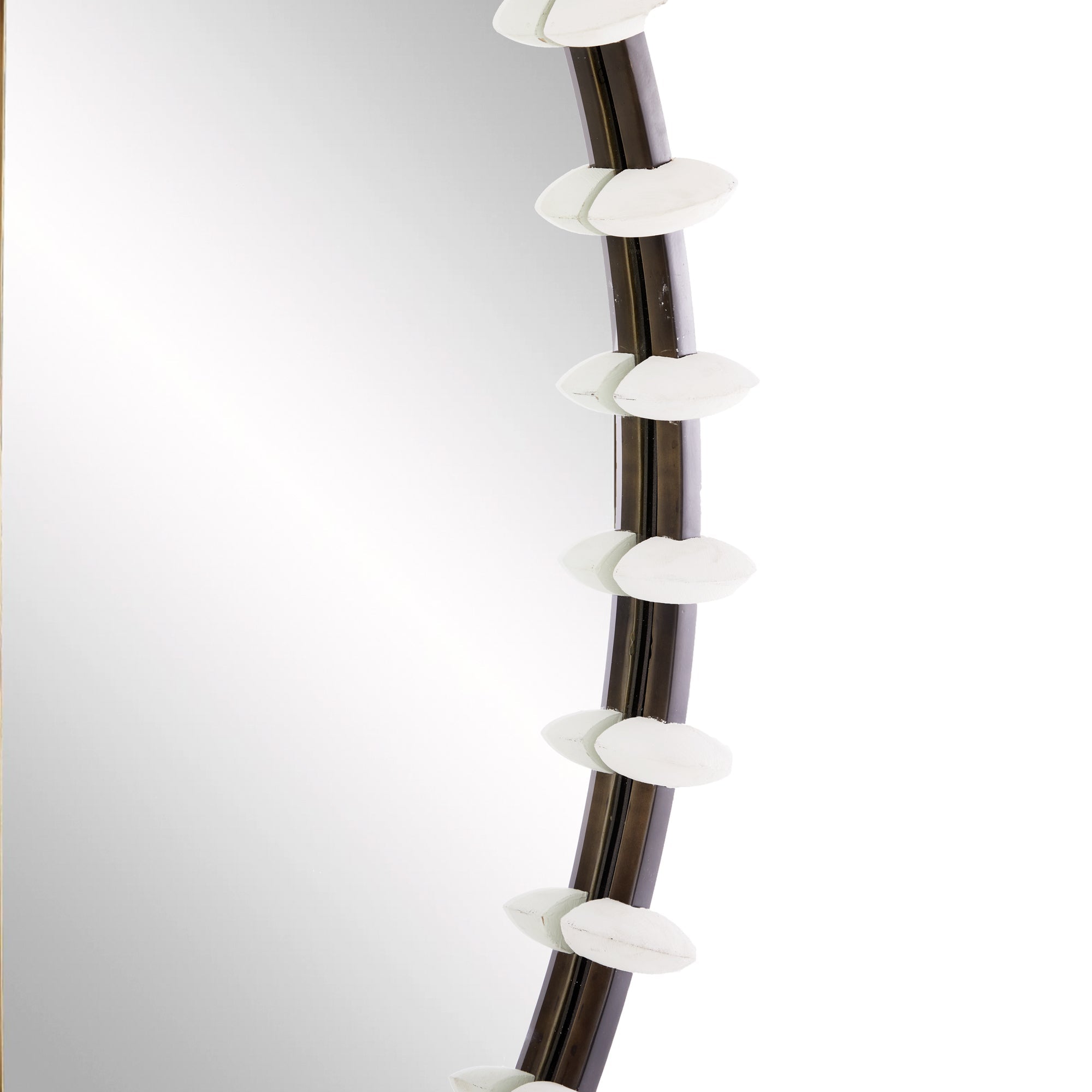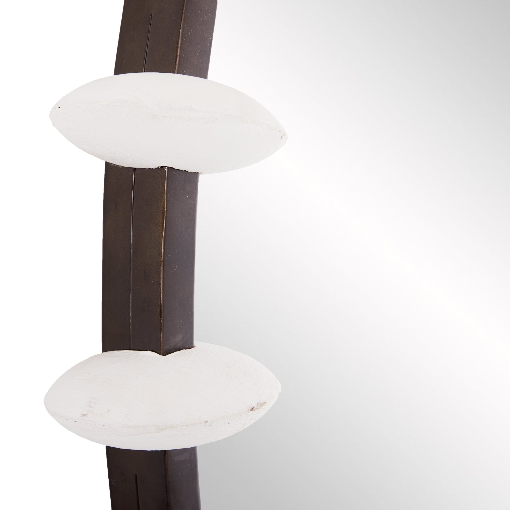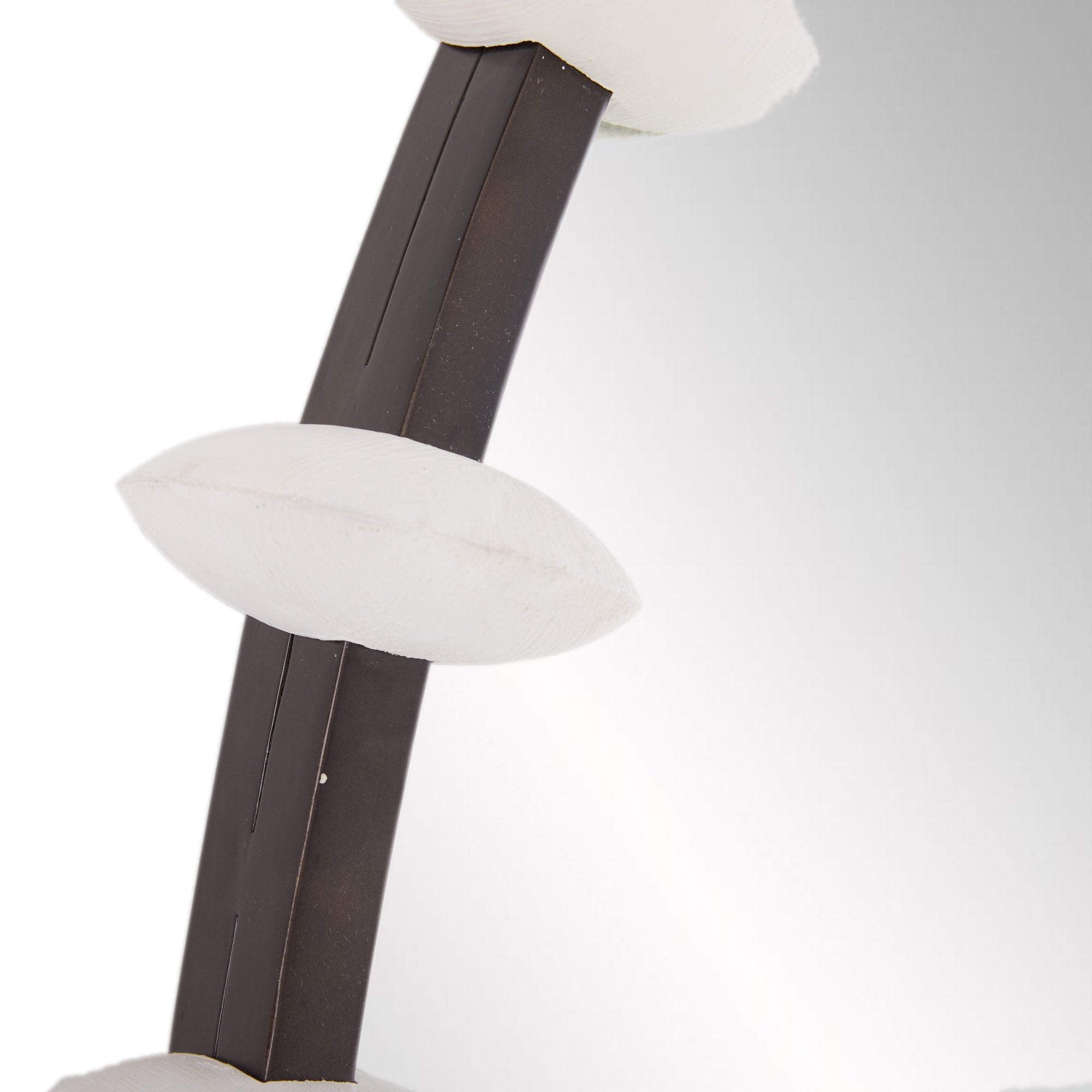 DescriptionImpactful for its volume and maximalist design, the Pira mirror features white gesso-finished iron saucer shapes that radiate around a bronze iron frame. The conceptual beauty makes timeless statement in any grand space. The mirror is fitted with a security cleat for hanging. Finish will vary.
