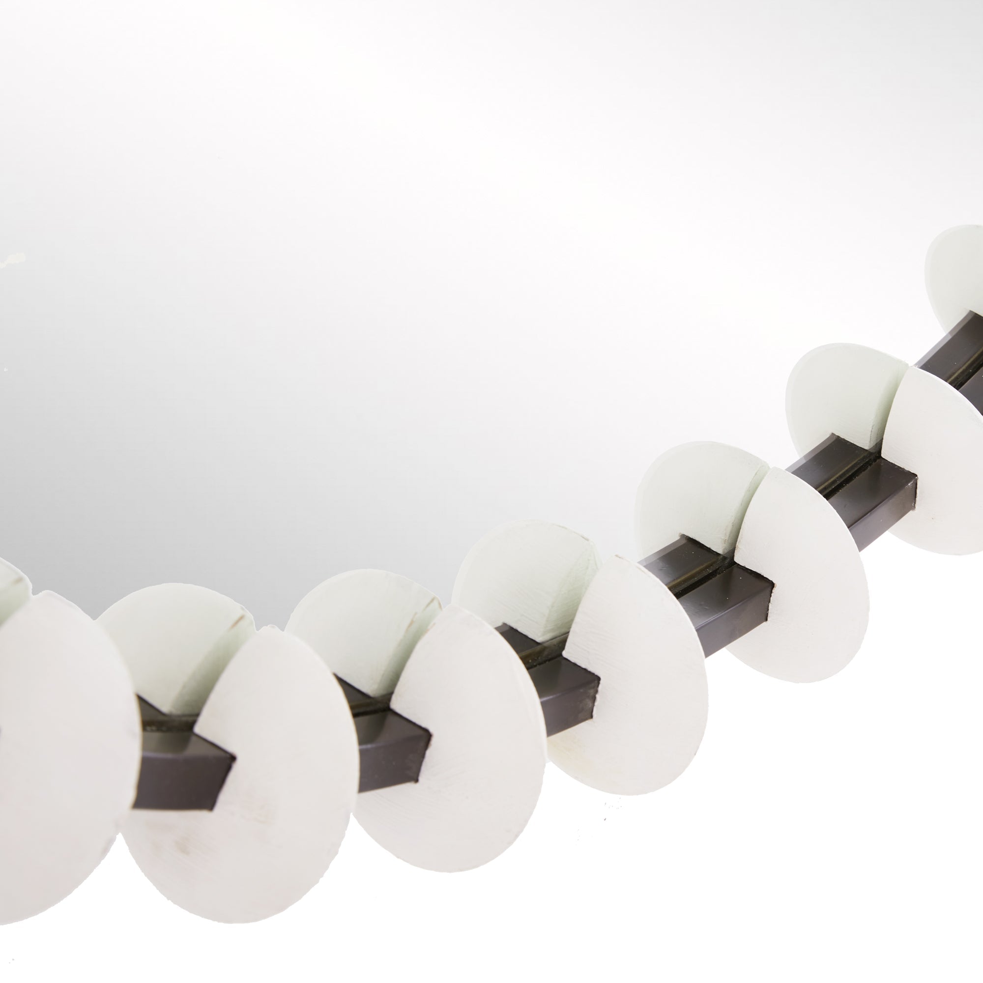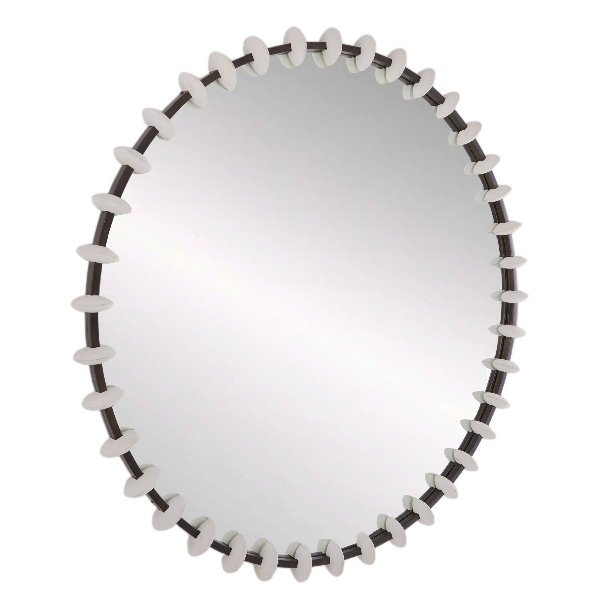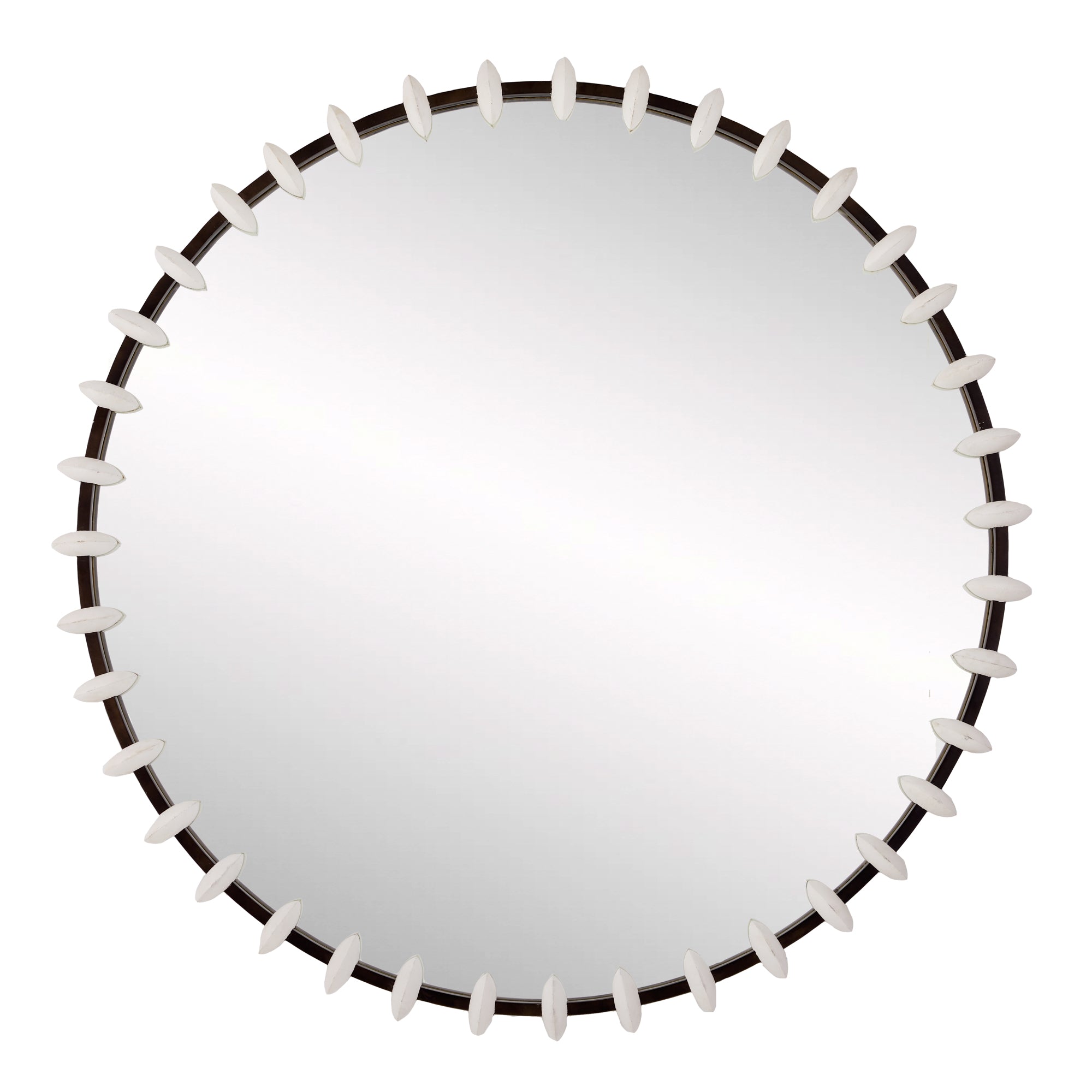 DescriptionImpactful for its volume and maximalist design, the Pira mirror features white gesso-finished iron saucer shapes that radiate around a bronze iron frame. The conceptual beauty makes timeless statement in any grand space. The mirror is fitted with a security cleat for hanging. Finish will vary.