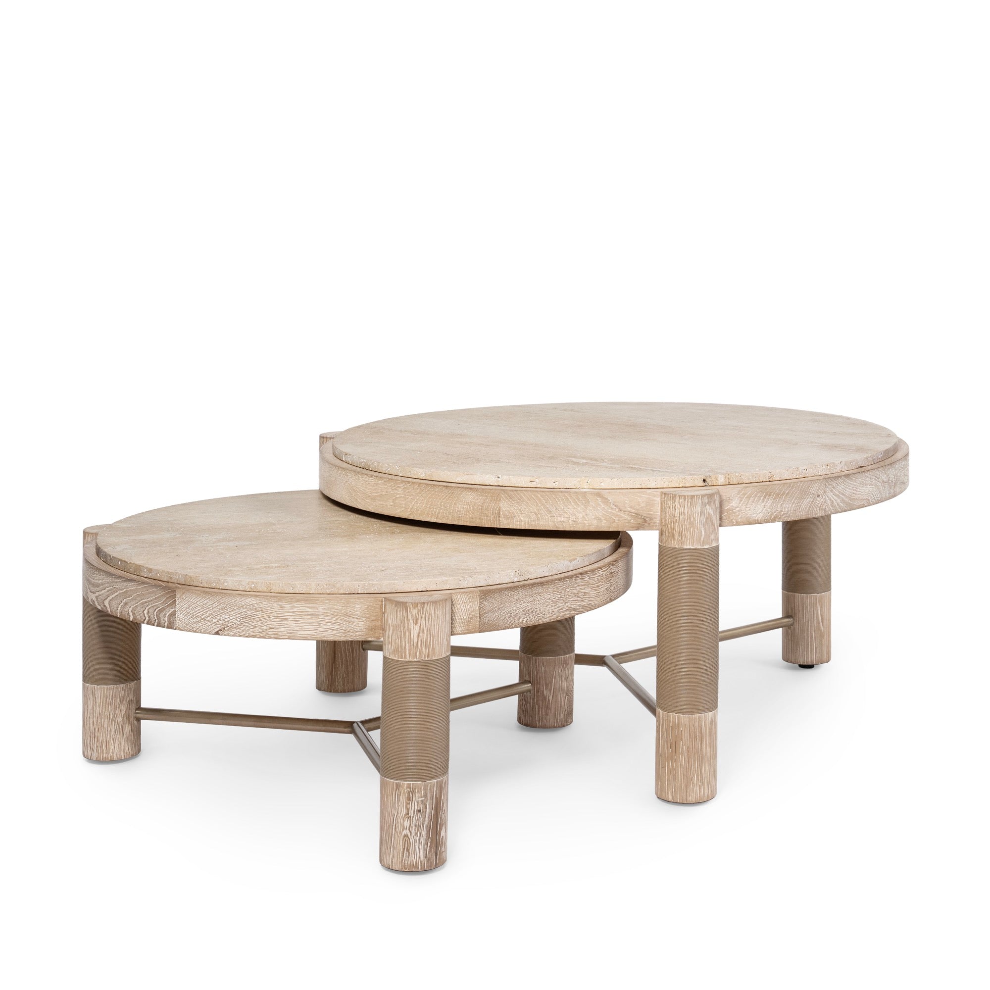 DescriptionSolid travertine stone top set in an open grain oak wood frame and legs featuring hand-wrapped tan leather accented with an antique finished brass cross bar. Travertine stone has a beautiful porous surface that will vary in color, grain and texture, no two pieces will be alike. Table coordinates with the Quentin collection and smaller version of this design (715502).