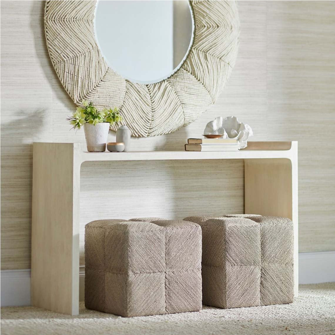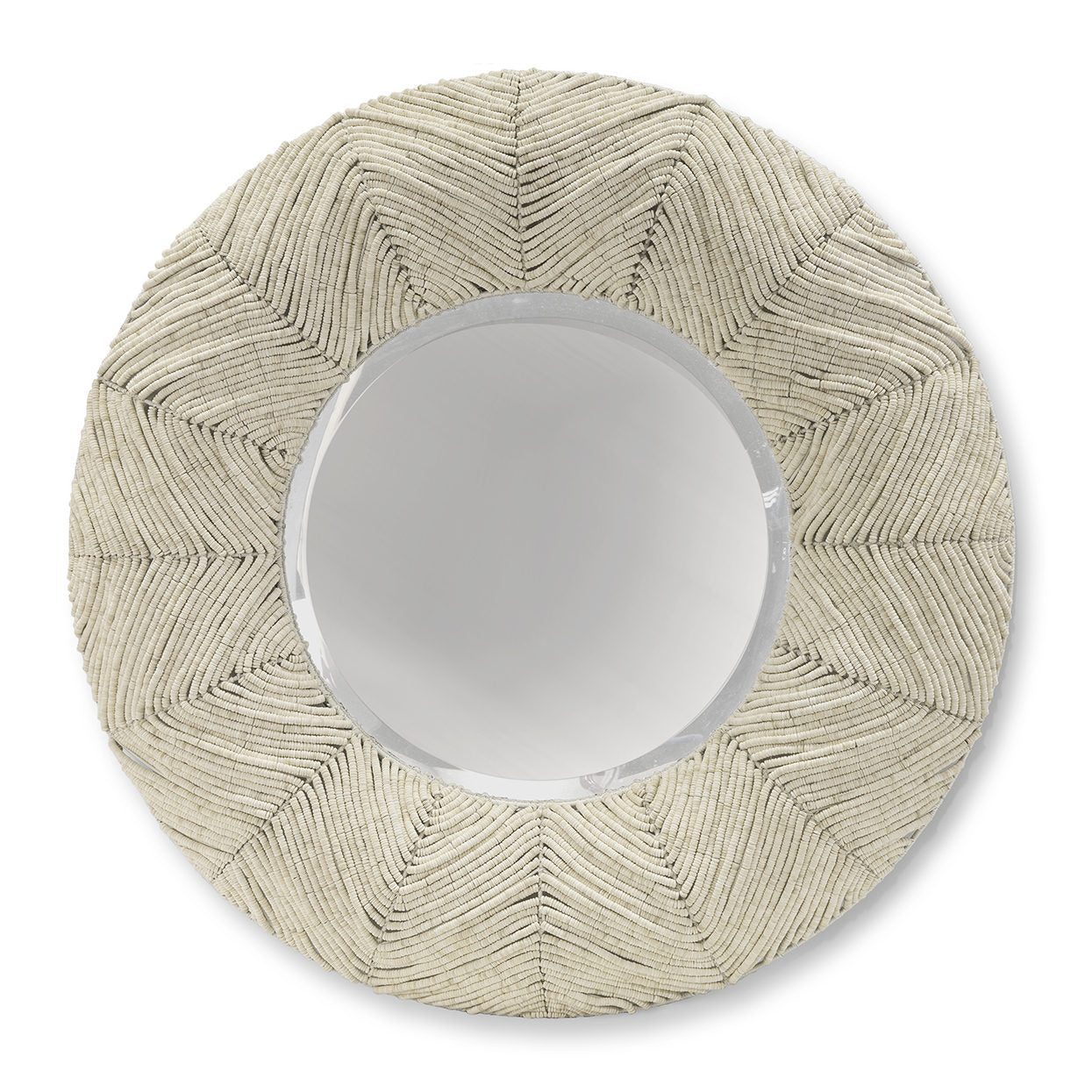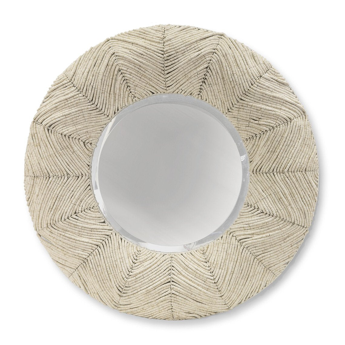 DescriptionBeveled mirror with metal frame embellished with coconut shell beads hand-sewnin a unique wave design. Mirror includes a metal hanger for mounting.