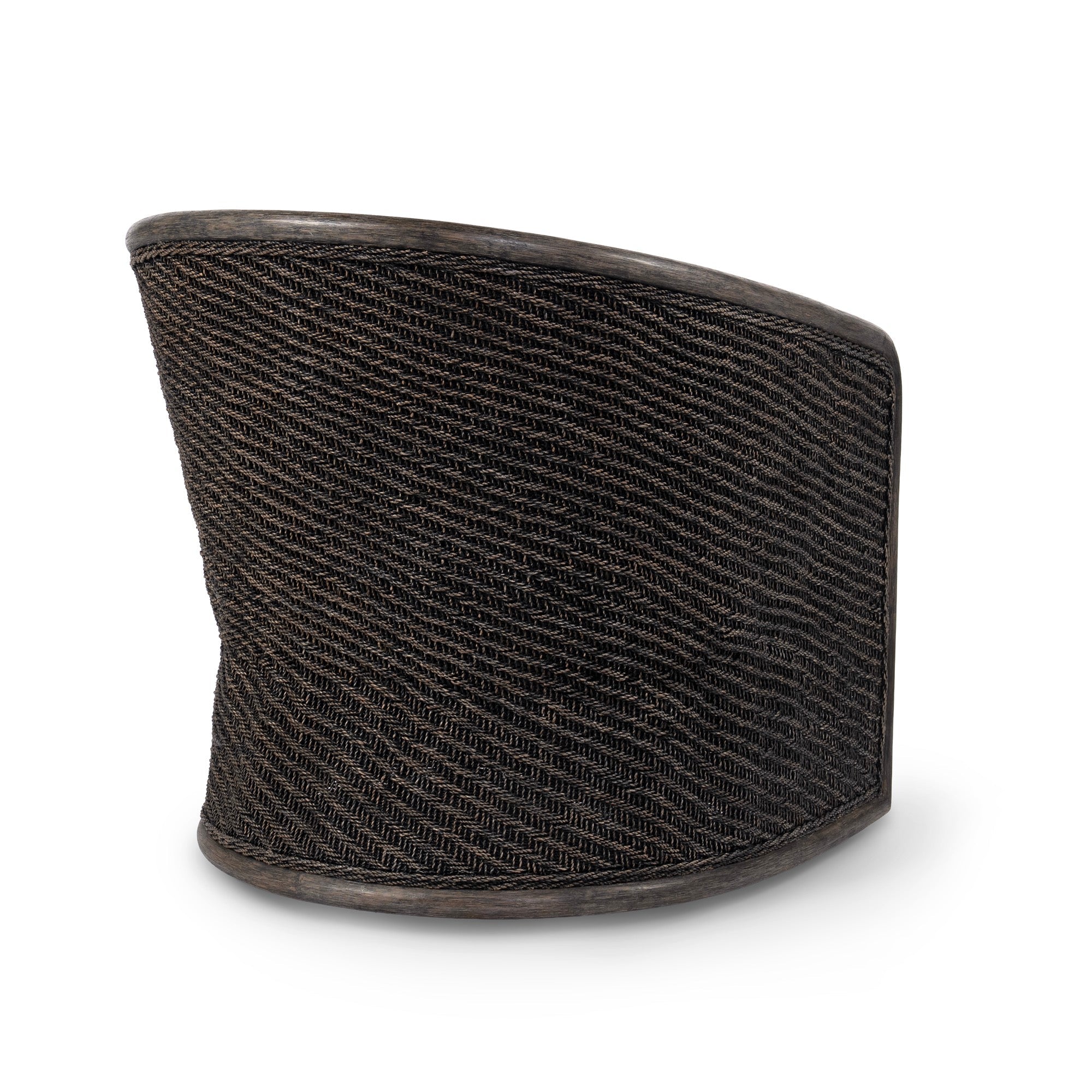 DescriptionLampakanay rope hand-twisted and braided over a hardwood frame in a unique diagonal pattern creating dimensional layers on the outside back, arms, and front apron, accented with distressed rattan trim all in a mocha brown finish. Chair features a 360 degree swivel mechanism with a fully upholstered inside back and a fixed upholstered seat.