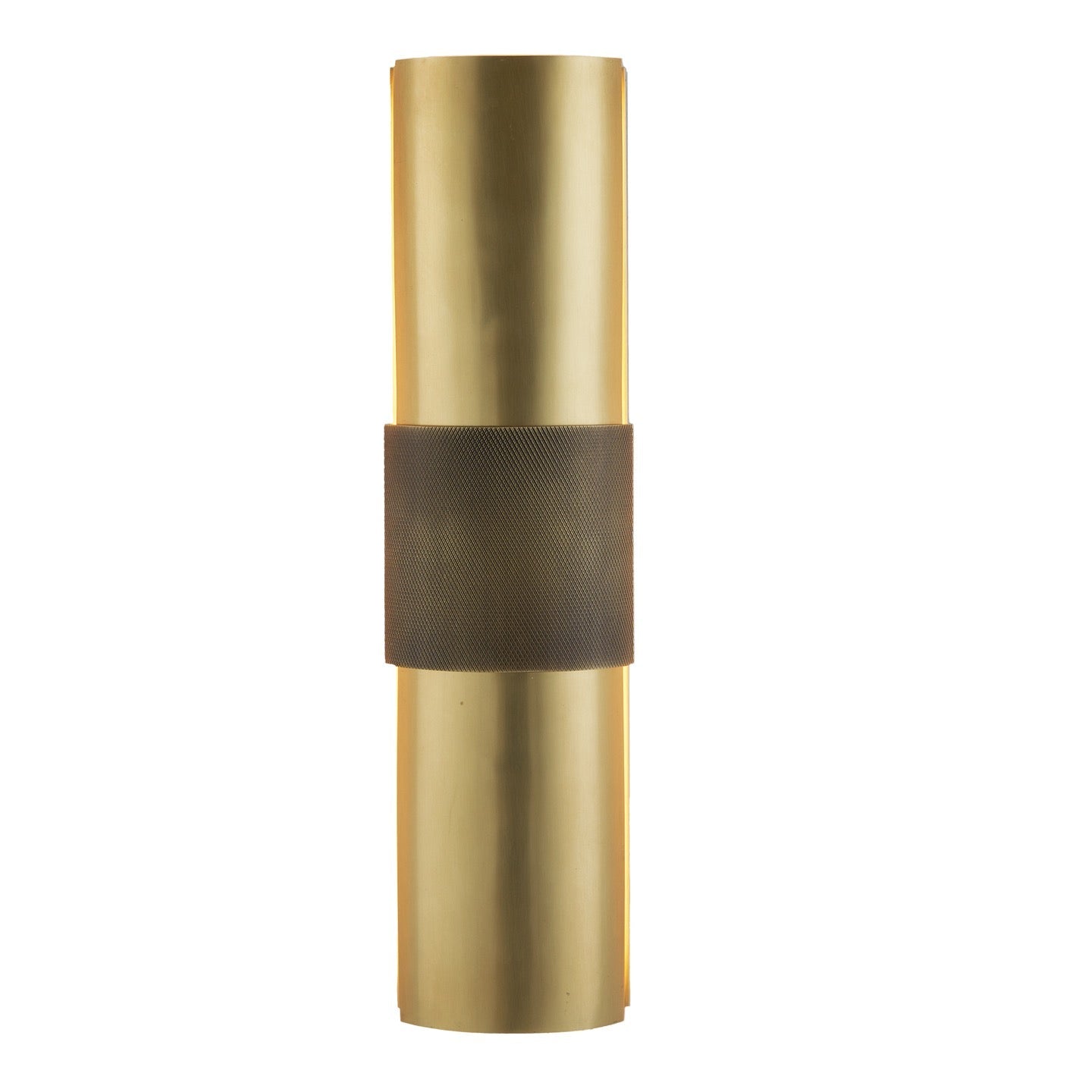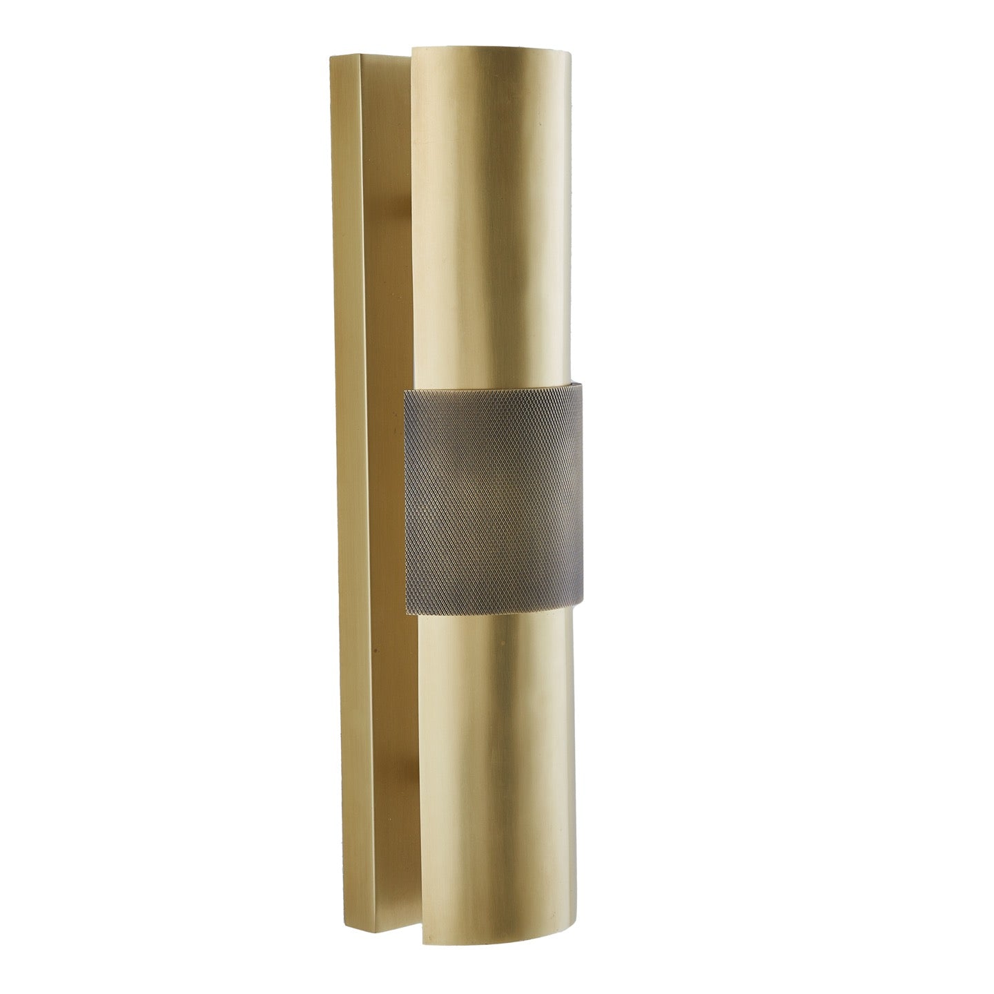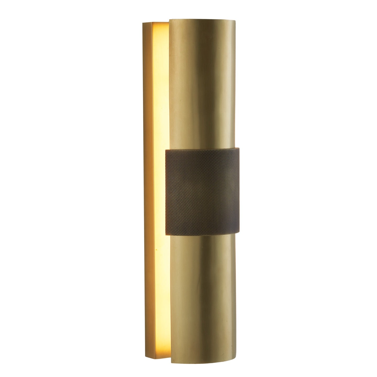 DescriptionSimple yet striking, our Samuel sconce is a masterful mix of materials and textures. A reflective demilune column of antique brass iron is interrupted with a contrasting decorative band of knurled antique brass iron. The modern LED sconce, fitted with a frosted acrylic interior diffuser, casts a back-lit glow. All Arteriors lighting pieces are re - wired with black wiring. During the re-wiring process for AU/NZ certification this items ceramic sockets have been replaced with black plastic sockets.