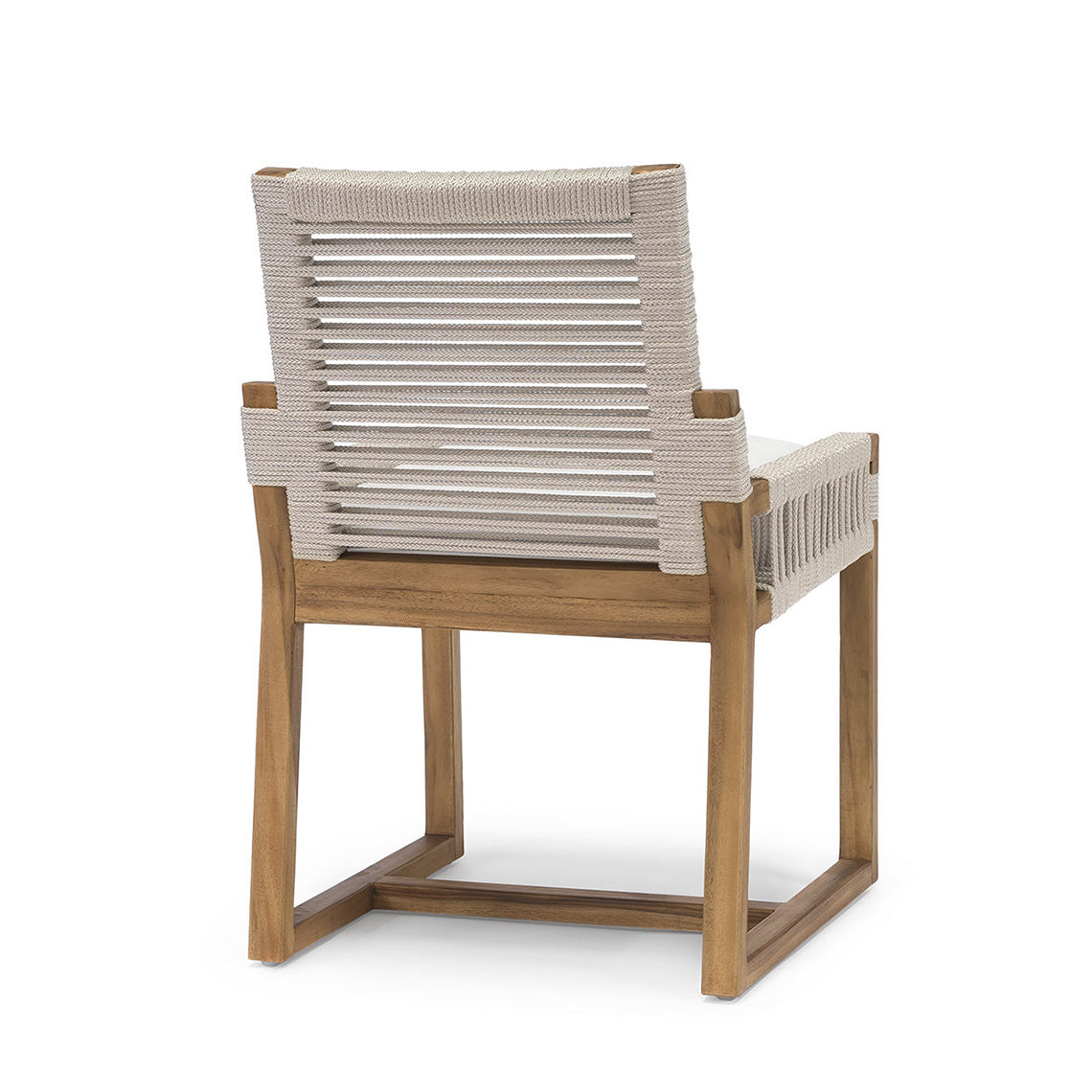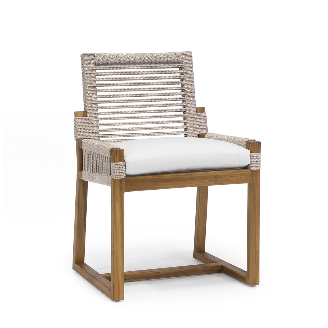 DescriptionTeak wood frame and legs in natural golden brown finish. Double wall back and arms in taupe colored woven marine grade synthetic rope with maximum UV protection. Chair comes with a loose seat cushion. Coordinates with the San Martin collection.