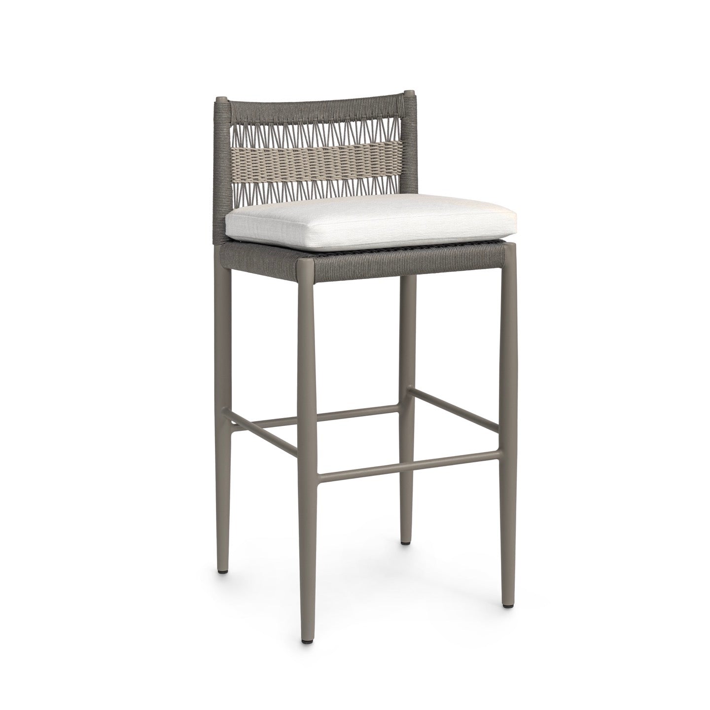DescriptionPowder coated aluminum frame in a matt beige finish featuring hand-wrapped synthetic rope in a two-tone charcoal grey accented with beige intricately woven together on the inside and outside back. Rope is resistant to cracking, peeling, fading and breaking. Stool comes with a loose seat cushion. Coordinates with the St. George outdoor collection.