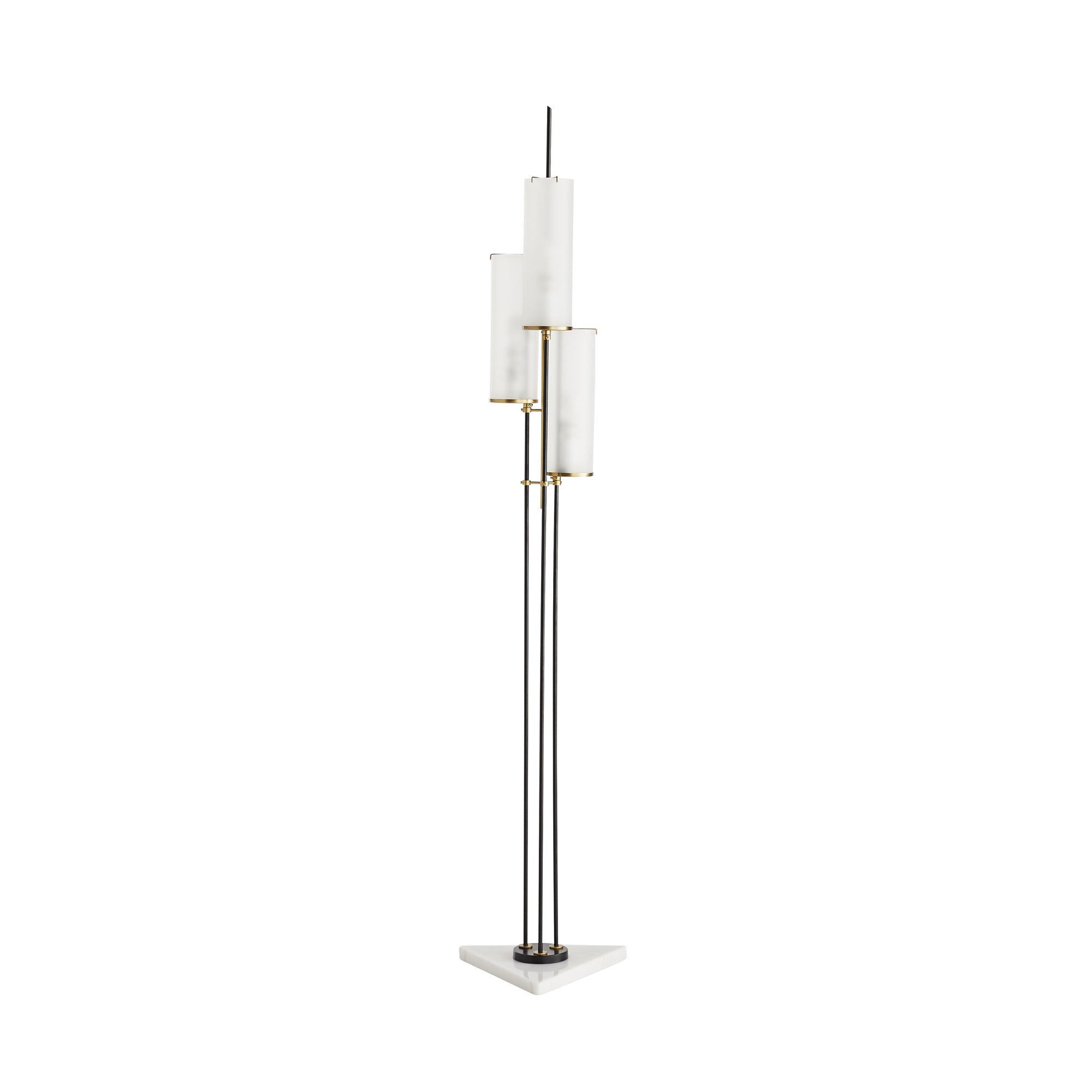 DescriptionThree light floor torchiere on a triangular marble base with staggered cylindrical frosted shades is mounted on black iron rods and accented with antique brass.