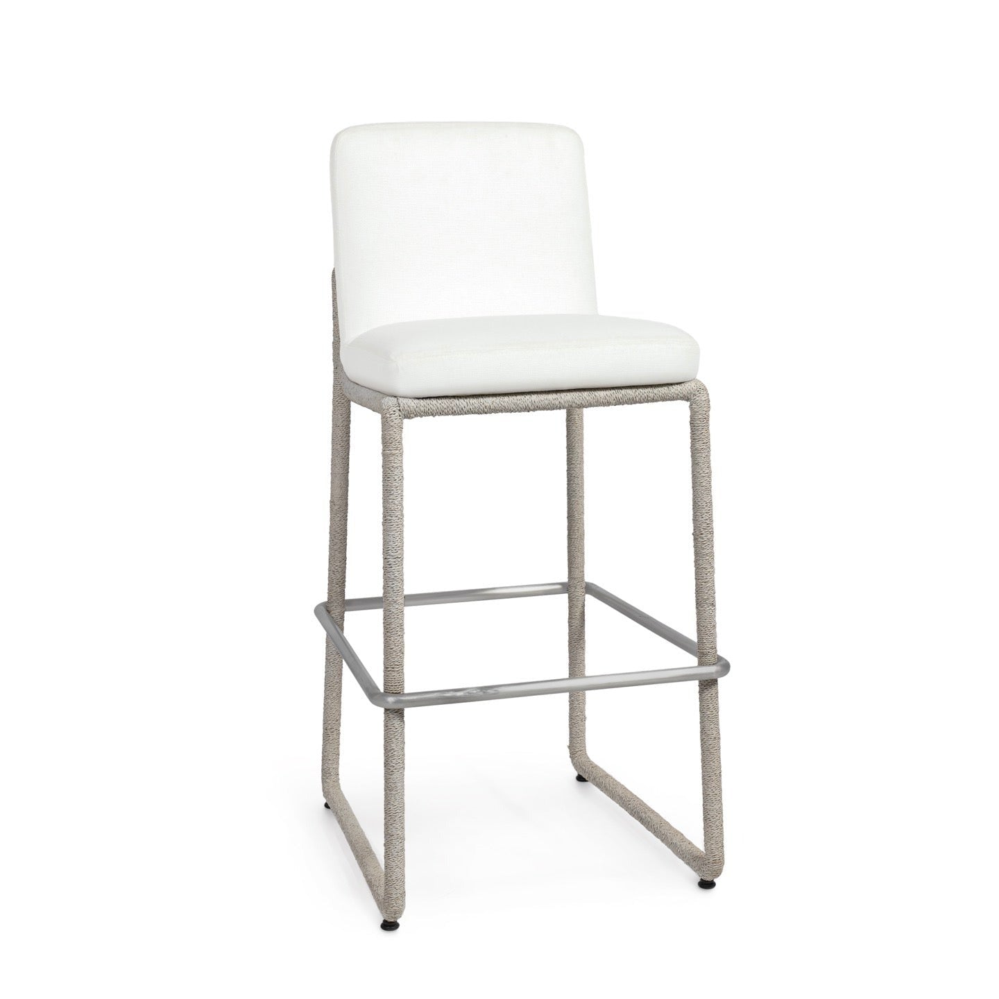 DescriptionWrought iron frame wrapped with lampakanay rope in a white sand finish accented with a stainless steel footrest. Stool comes with a fixed upholstered seat and fully upholstered back. Coordinates with the Stillwater white sand collection.