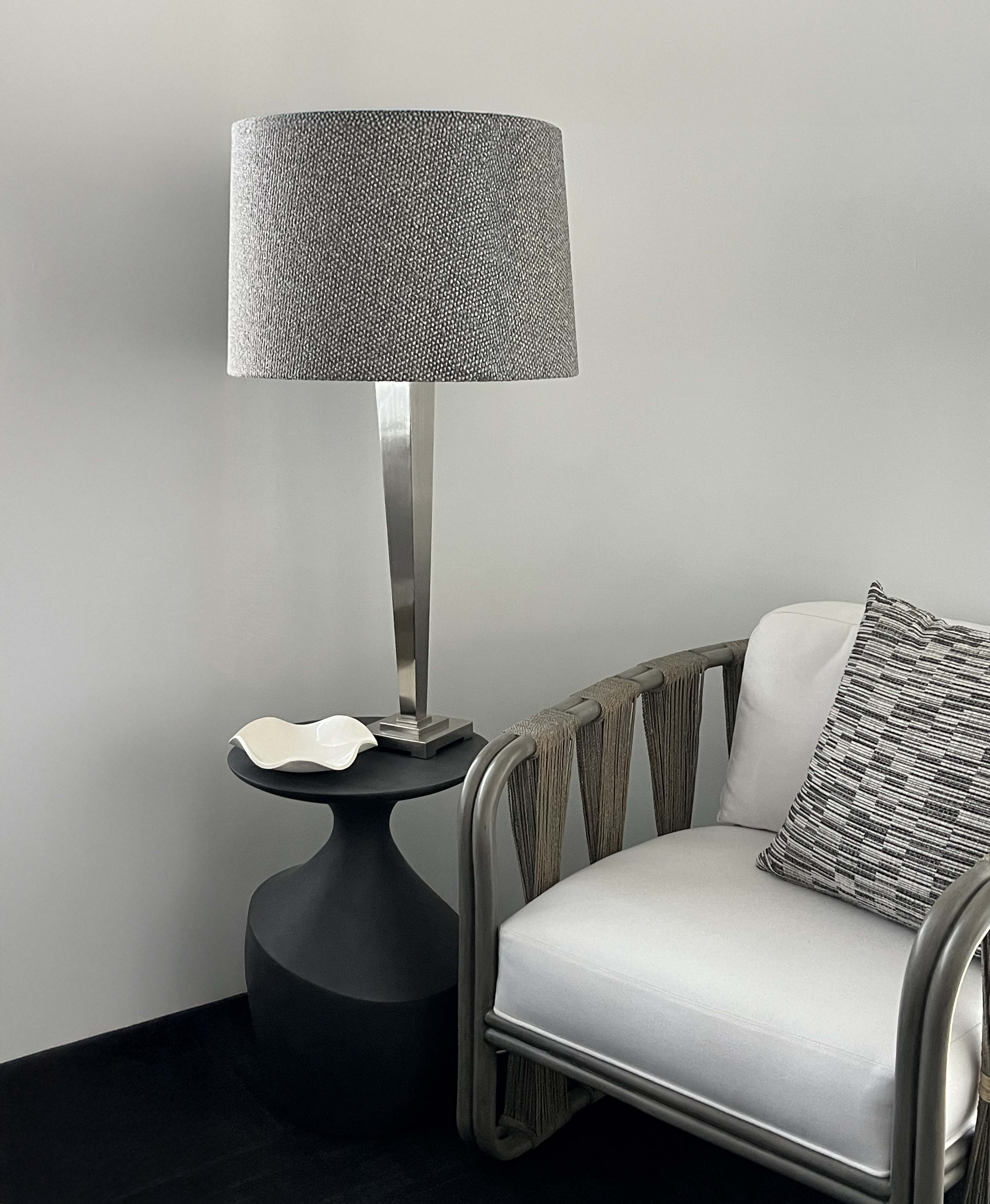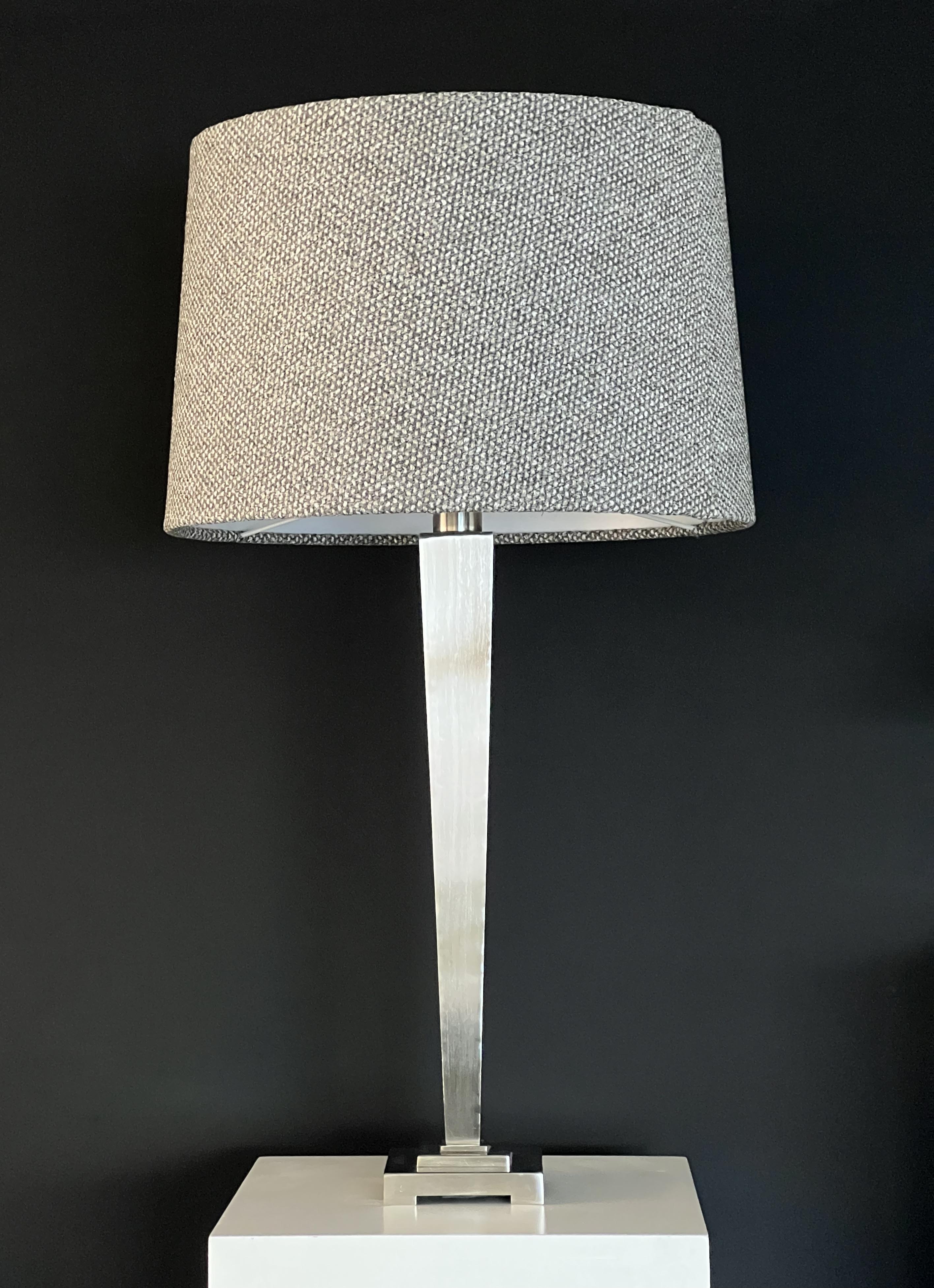 The Talbot Table Lamp brings refined elegance to any room with its polished nickel base and generously proportioned empire shade crafted from substantial grey fabric. This sophisticated lighting fixture combines timeless design with contemporary appeal, casting a warm, inviting glow while serving as a striking focal point on bedside tables, desks, or living spaces.