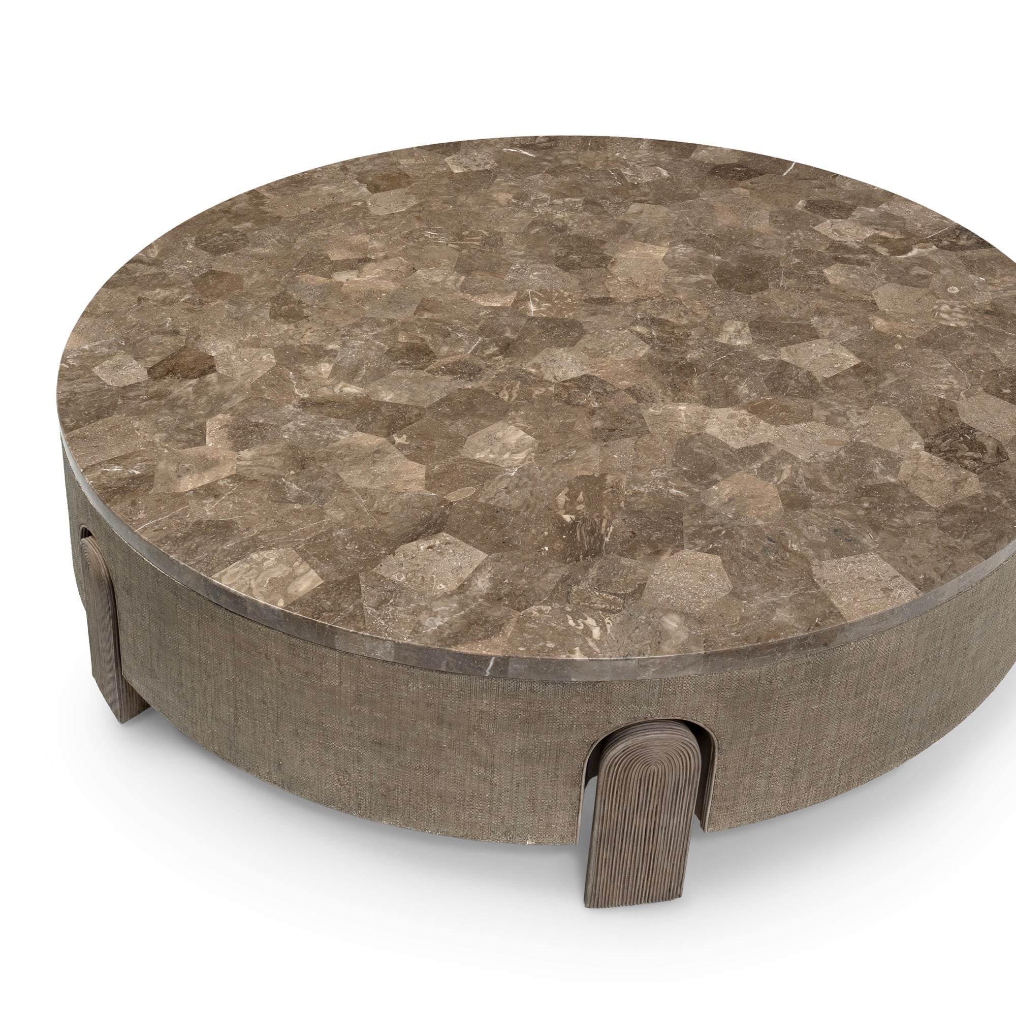 DescriptionTable features a hand-cut mocha stone laminated top over a natural grasscloth wrapped base, accented with inlaid hand-bent core rattan legs placed in a cut-out floating design.