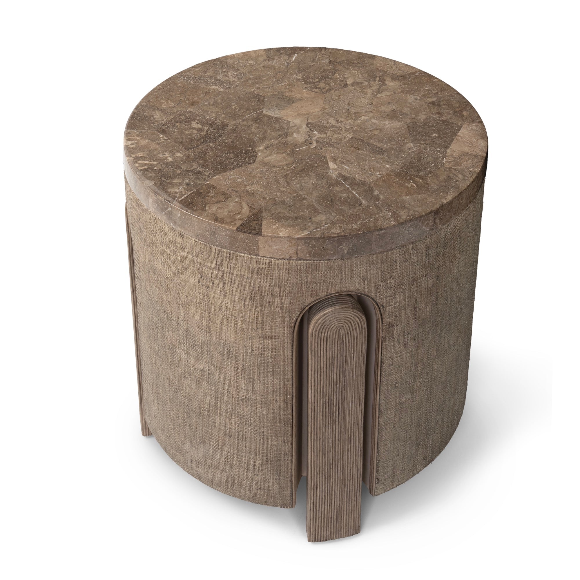 DescriptionTable features a hand-cut mocha stone laminated top over a natural grasscloth wrapped base, accented with inlaid hand-bent core rattan legs placed in a cut-out floating design.
