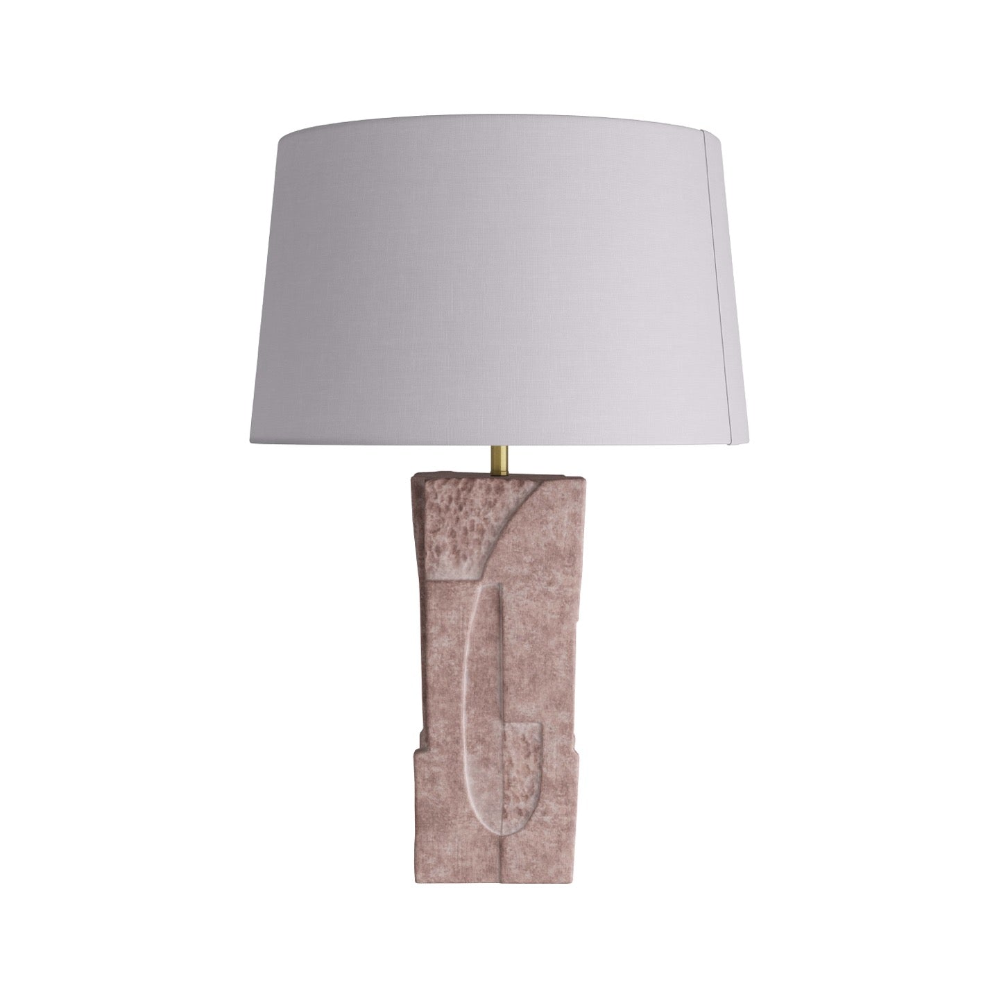 DescriptionThe table lamp is crafted in an acorn terracotta, and features hand-carved cutouts and texture. The piece is finished with a matching terracotta sphere finial and an off-white linen drum shade, lined in off-white cotton. Finish will vary