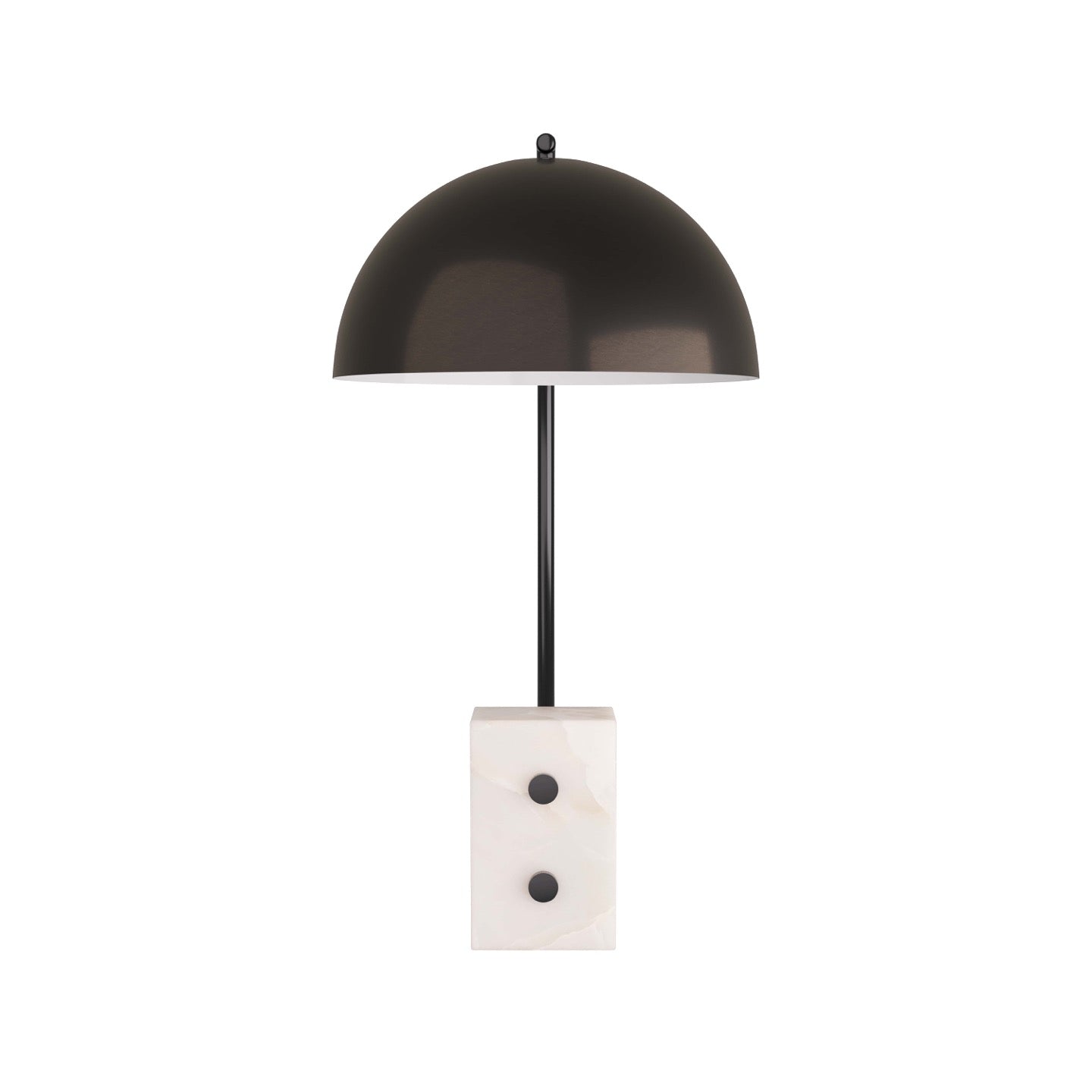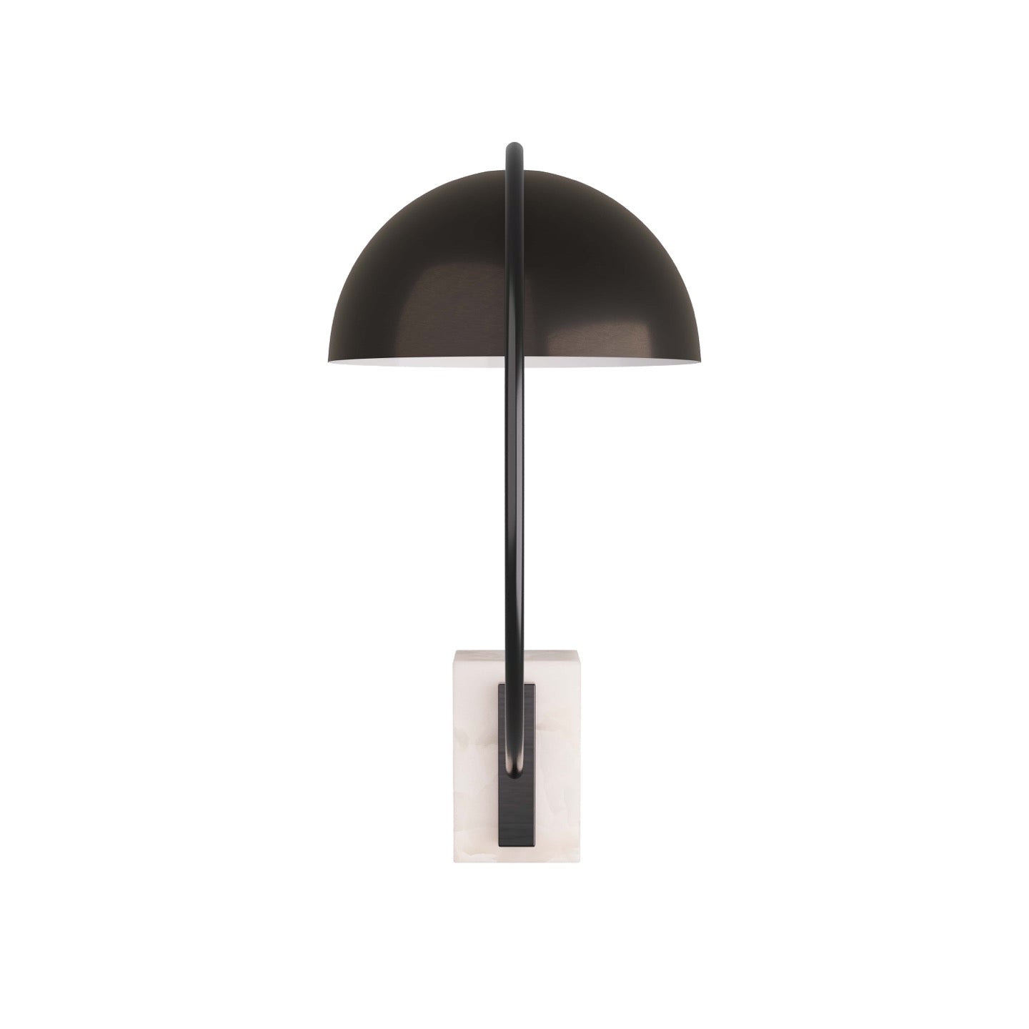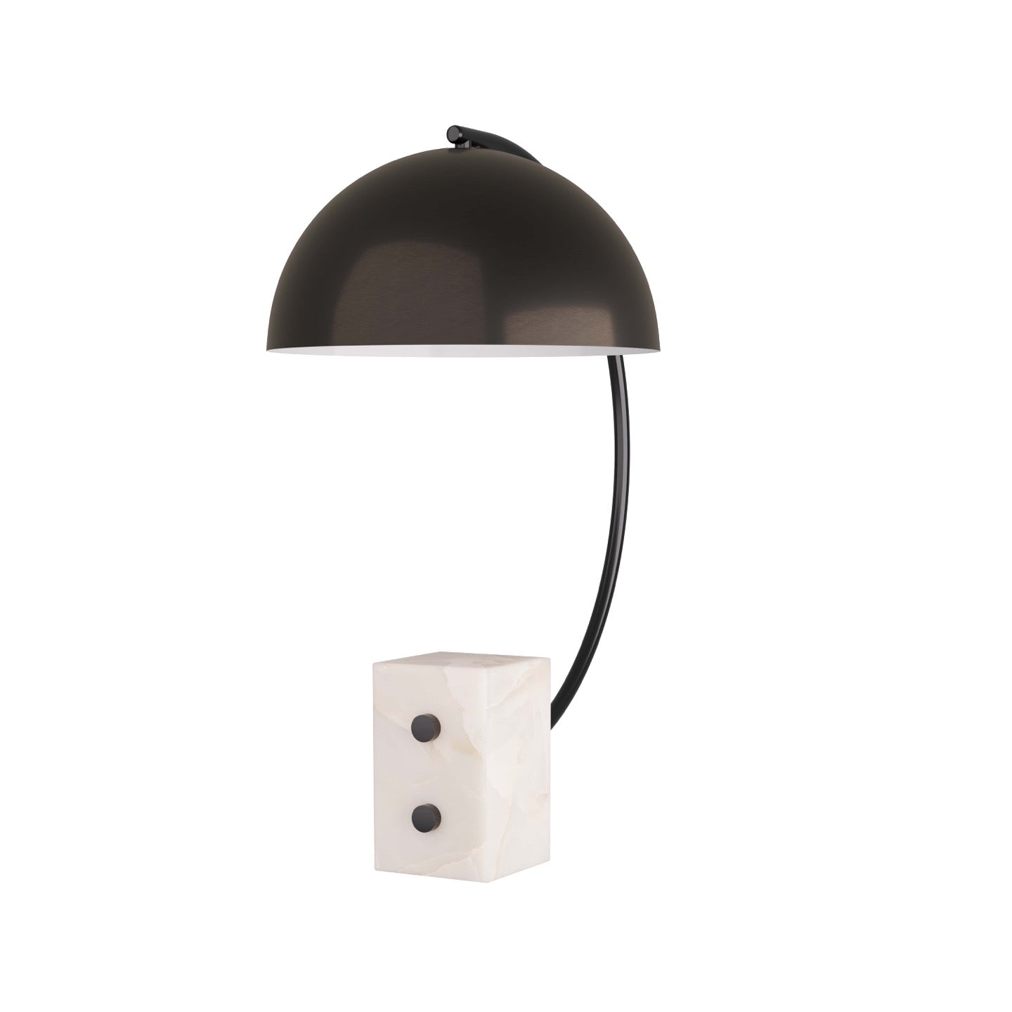 DescriptionIntroducing the weslan lamp, a pharmacy-style lamp with old-meets-new vibes. The task lamp features a domed, english bronze-finished steel metal lamp shade lined in white lacquer. A c-shaped arm connects the lamp to a geometric white alabaster base. Finish may vary