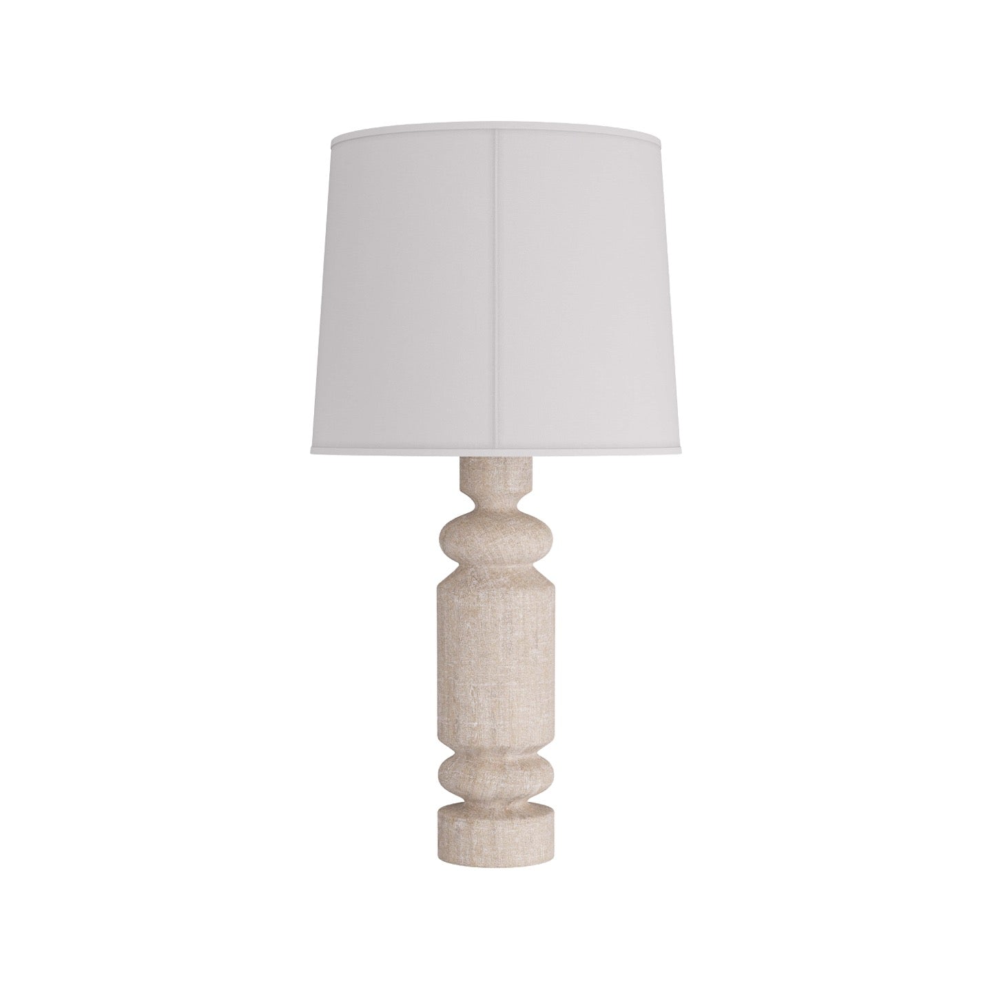 DescriptionThe piece is created in turned mango wood with a lime-wash finish, allowing the natural beauty of the wood grain to remain visible. A matching wood finial and an off-white linen drum shade, lined in off-white cotton, complete the lamp. Finish will vary