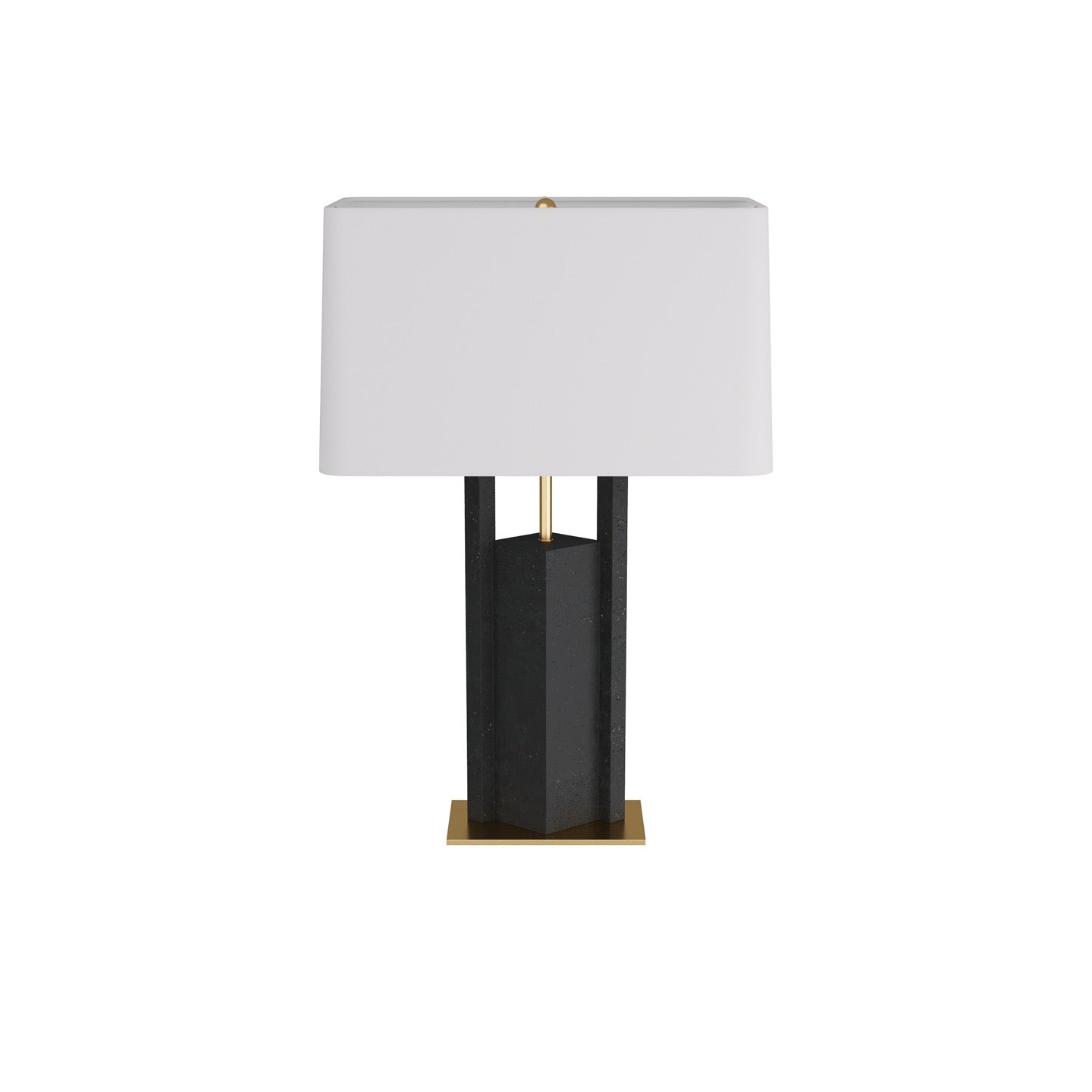 DescriptionAccented with an antique brass support and base for contrast, this geometric style is a masculine, modernist accent for any room. Topped with a rectangular drum shade in off-white microfiber lined in cotton. Taupe cloth-wrapped cord and three-way rotary switch. Finish will vary
